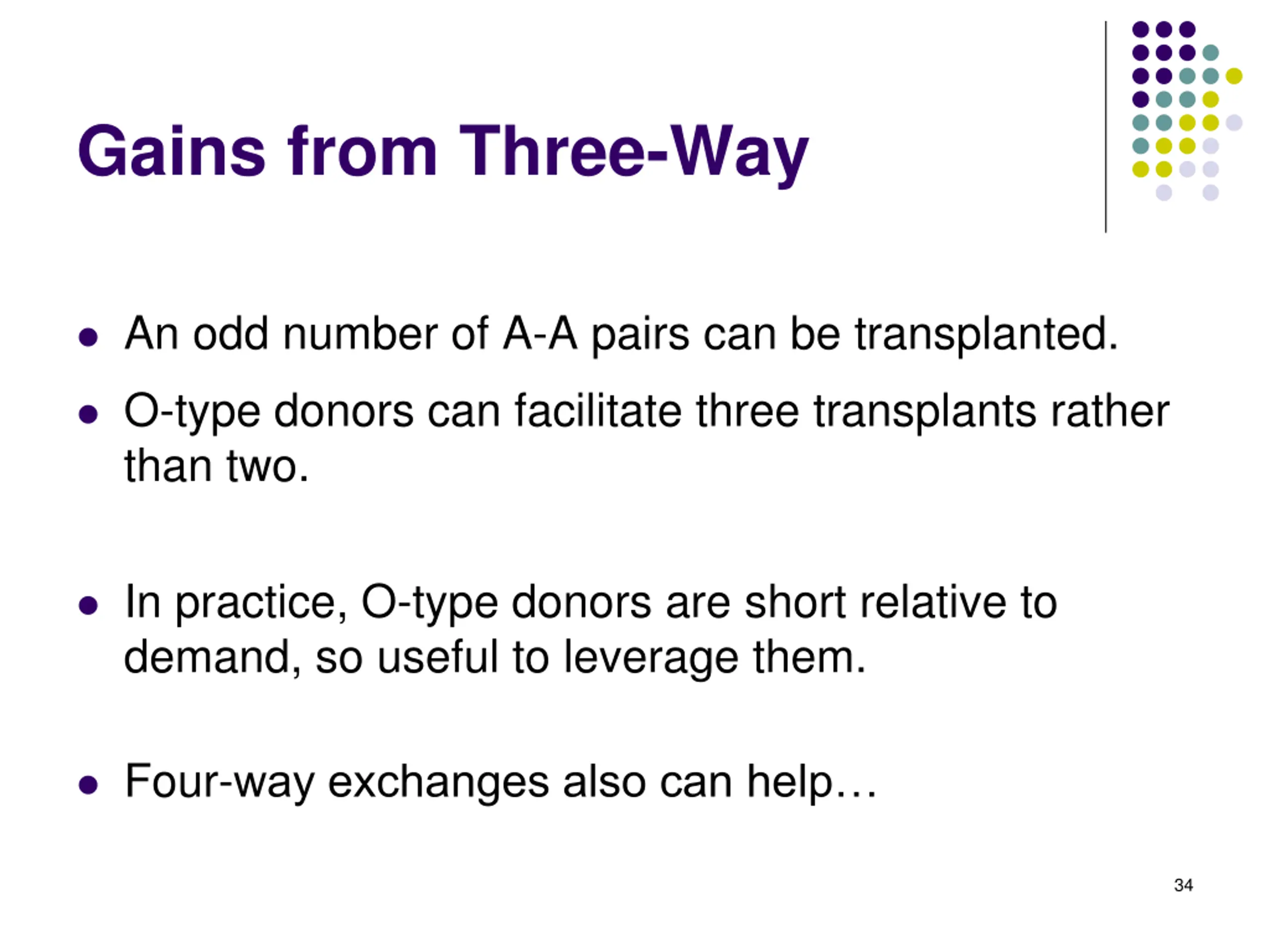 Gains from Three-Way An odd number of A-A pairs can be transplanted. O-type donors can facilitate three transplants rather than two. In practice, O-type donors are short relative to demand, so useful to leverage them. Four-way exchanges also can help 34