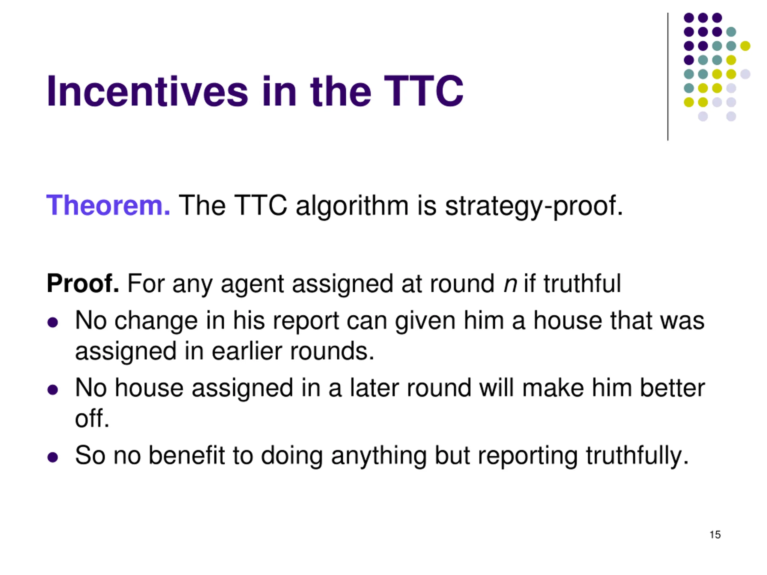 Incentives in the TTC Theorem. The TTC algorithm is strategy-proof. Proof. For any agent assigned at round n if truthful No change in his report can given him a house that was assigned in earlier rounds. No house assigned in a later round will make him better off. So no benefit to doing anything but reporting truthfully. 15