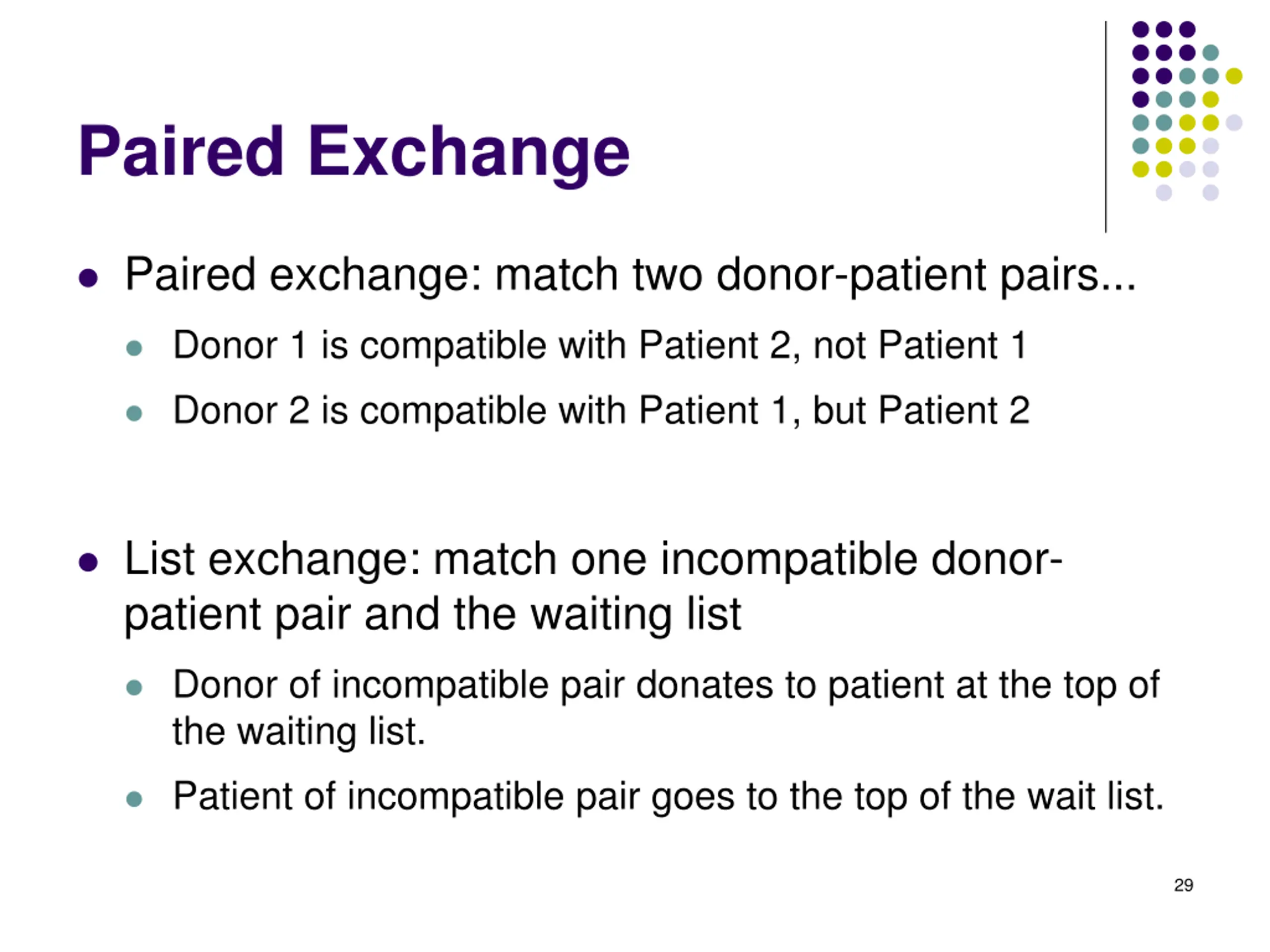 Paired Exchange Paired exchange: match two donor-patient pairs... Donor 1 is compatible with Patient 2, not Patient 1 Donor 2 is compatible with Patient 1, but Patient 2 List exchange: match one incompatible donor- patient pair and the waiting list Donor of incompatible pair donates to patient at the top of the waiting list. Patient of incompatible pair goes to the top of the wait list. 29