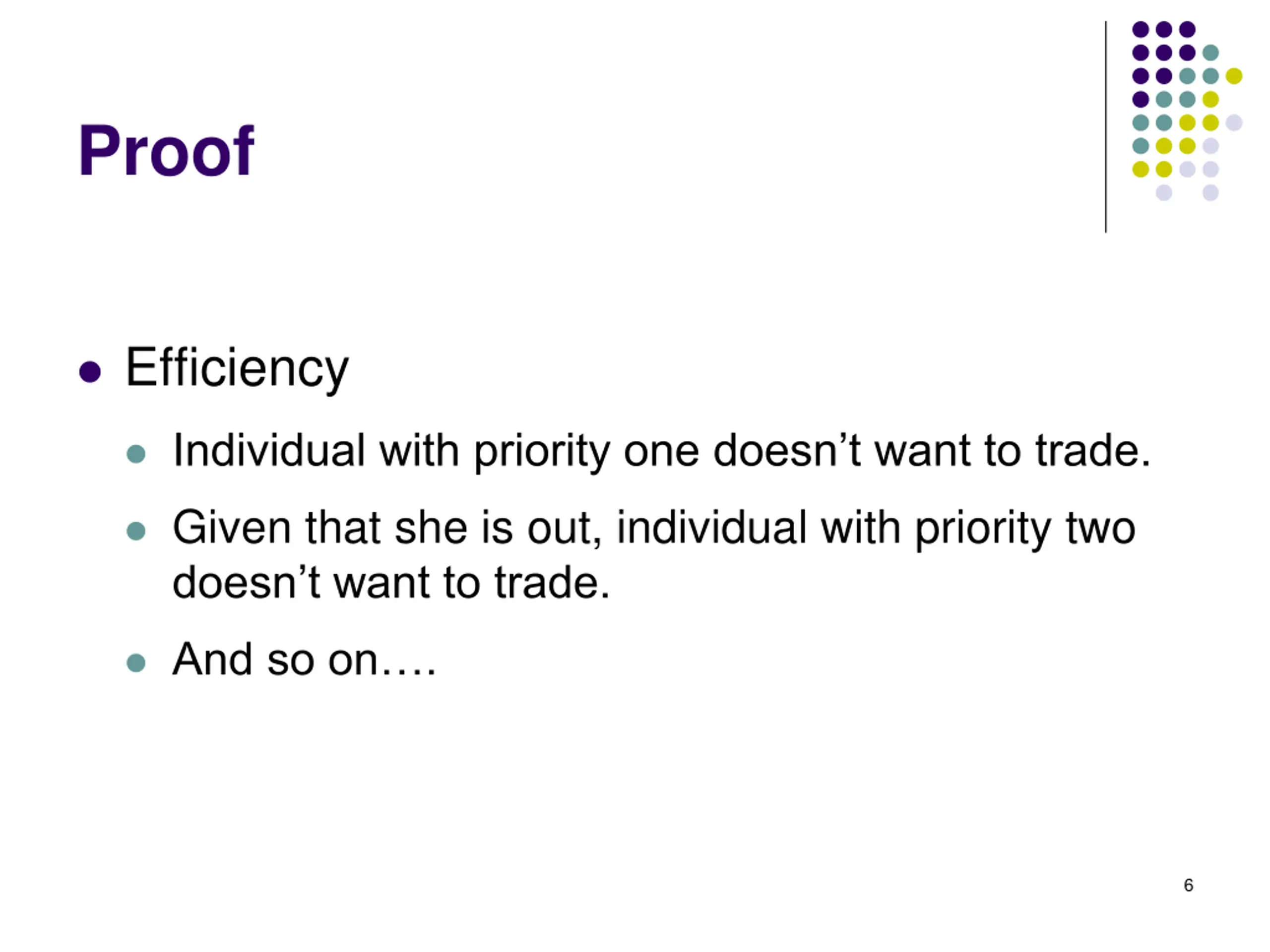 Proof Efficiency Individual with priority one doesn t want to trade. Given that she is out, individual with priority two doesn t want to trade. And so on . 6