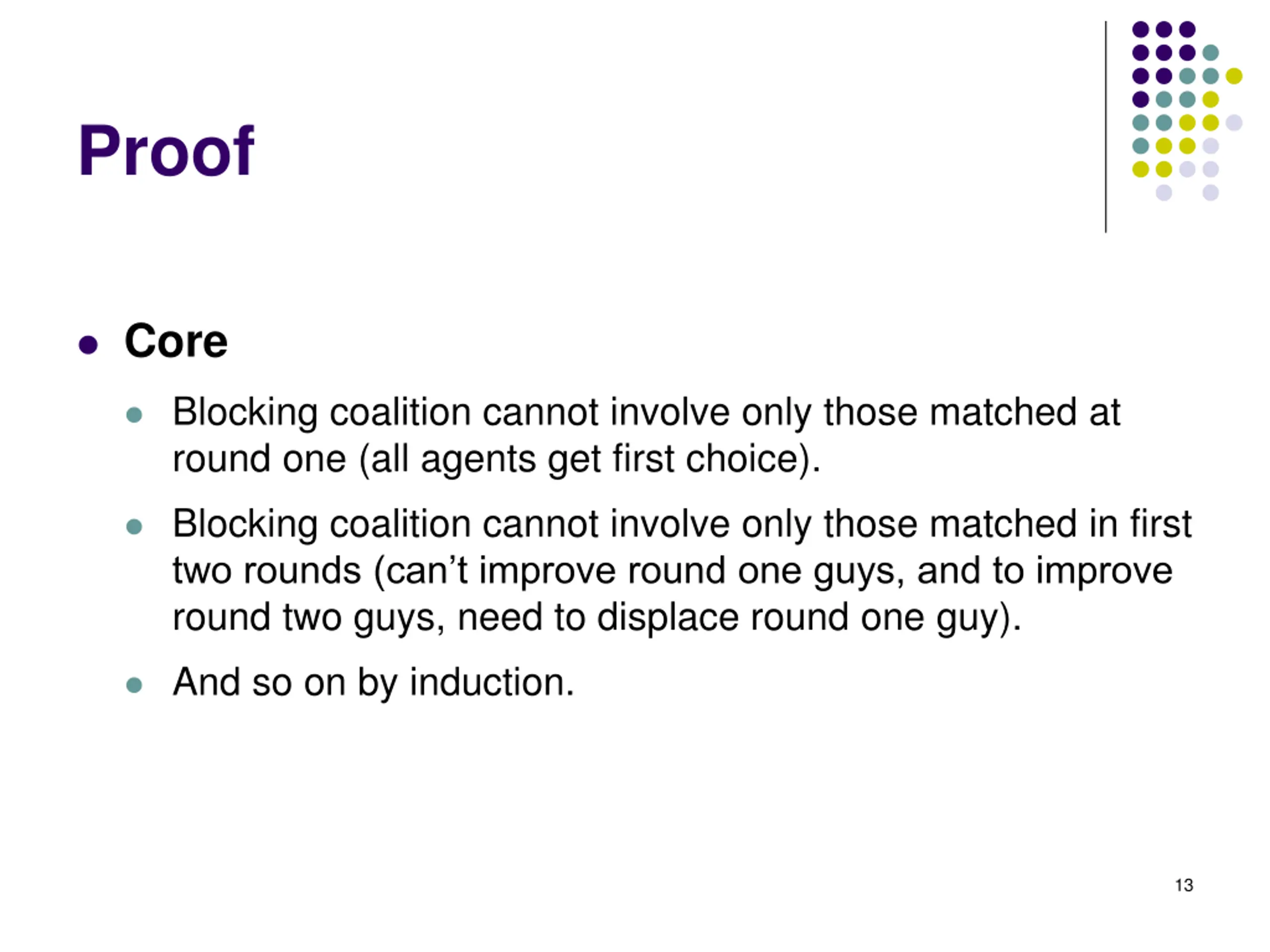 Proof Core Blocking coalition cannot involve only those matched at round one (all agents get first choice). Blocking coalition cannot involve only those matched in first two rounds (can t improve round one guys, and to improve round two guys, need to displace round one guy). And so on by induction. 13