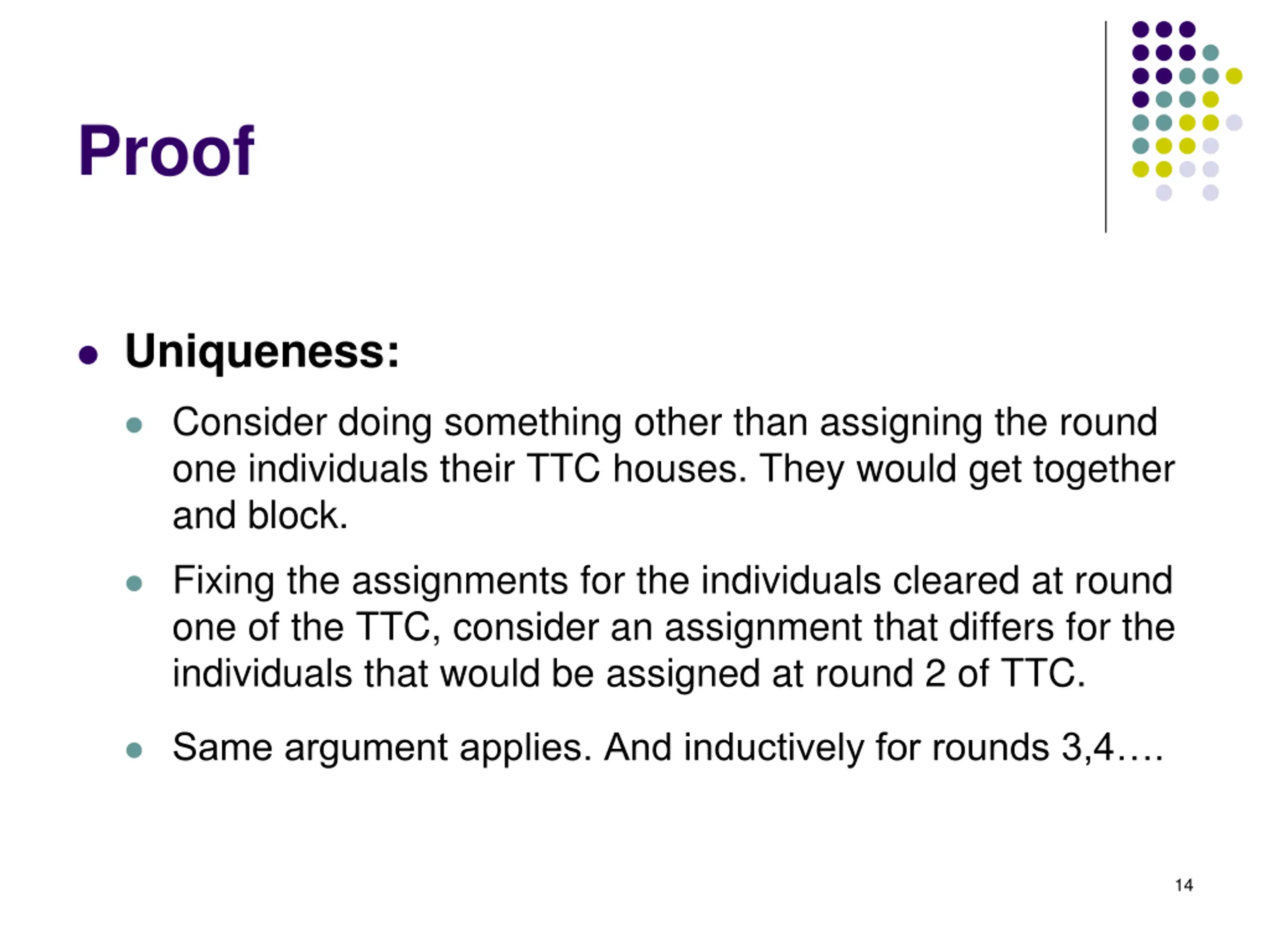 Proof Uniqueness: Consider doing something other than assigning the round one individuals their TTC houses. They would get together and block. Fixing the assignments for the individuals cleared at round one of the TTC, consider an assignment that differs for the individuals that would be assigned at round 2 of TTC. Same argument applies. And inductively for rounds 3,4 . 14