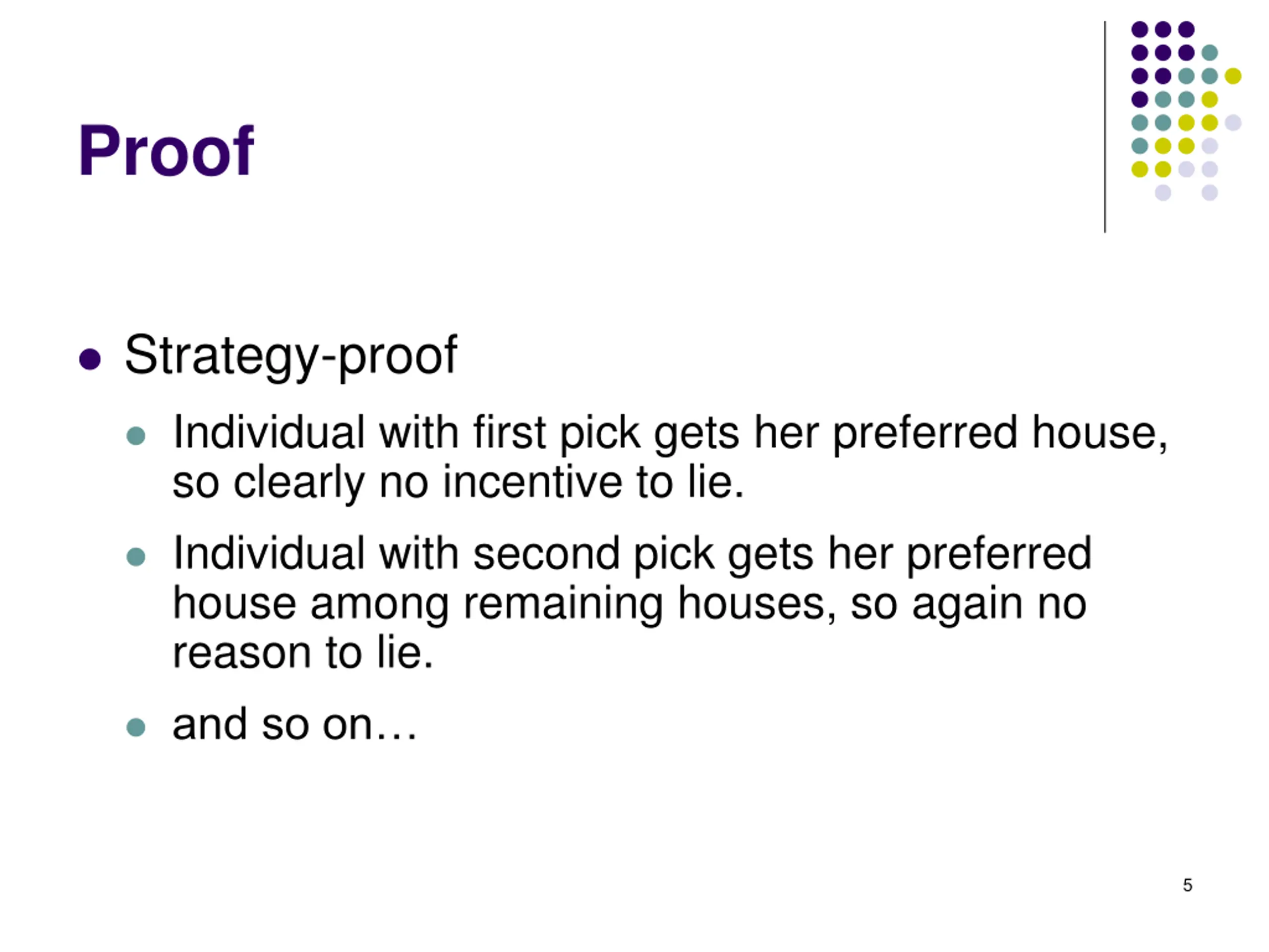 Proof Strategy-proof Individual with first pick gets her preferred house, so clearly no incentive to lie. Individual with second pick gets her preferred house among remaining houses, so again no reason to lie. and so on 5