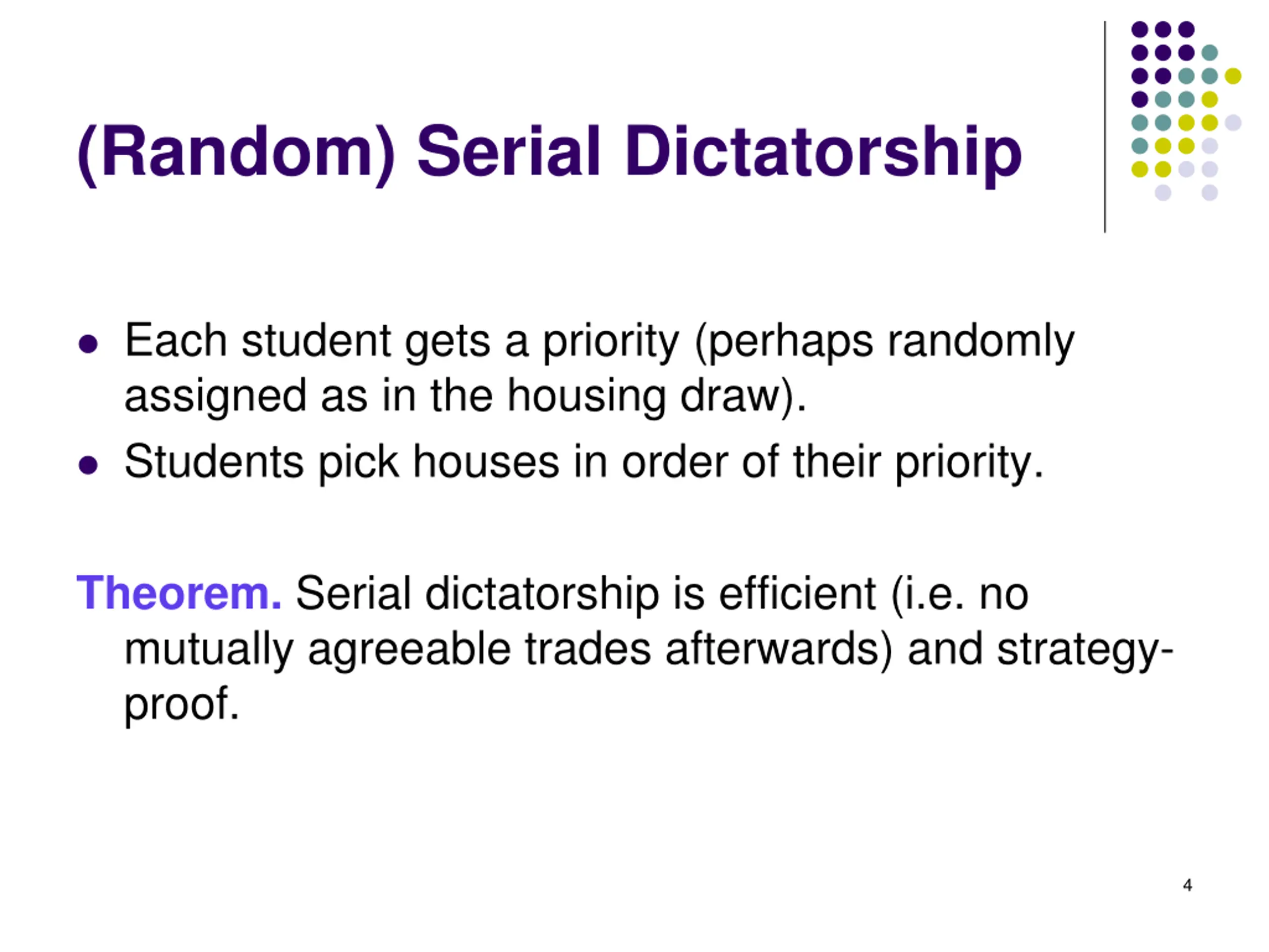 (Random) Serial Dictatorship Each student gets a priority (perhaps randomly assigned as in the housing draw). Students pick houses in order of their priority. Theorem. Serial dictatorship is efficient (i.e. no mutually agreeable trades afterwards) and strategy- proof. 4
