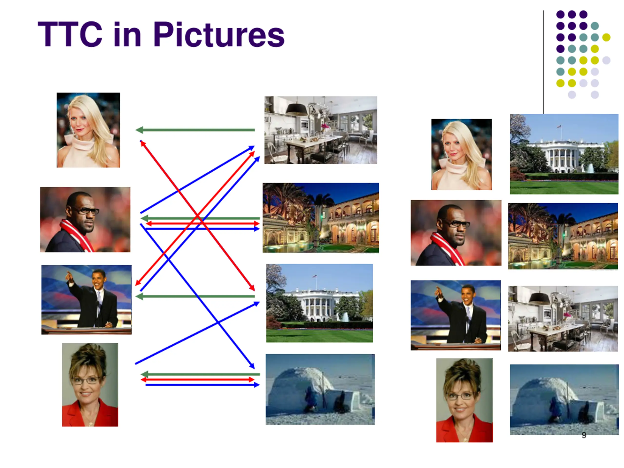 Top Trading Cycles Now imagine that individuals start with a house, but the original allocation might not be efficient. Gale s TTC algorithm Each person points to most preferred house Each house points to its owner This creates a directed graph, with at least one cycle. Remove all cycles, assigning people to the house they are pointing at. Repeat using preference lists where the assigned houses have been deleted. 8
