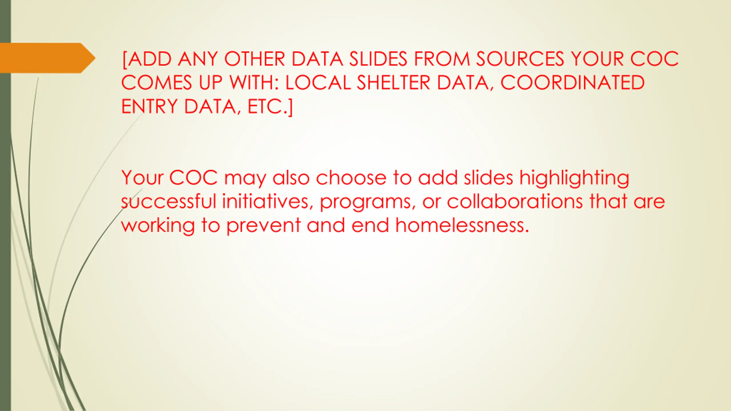 [ADD ANY OTHER DATA SLIDES FROM SOURCES YOUR COC COMES UP WITH: LOCAL SHELTER DATA, COORDINATED ENTRY DATA, ETC.] Your COC may also choose to add slides highlighting successful initiatives, programs, or collaborations that are working to prevent and end homelessness.