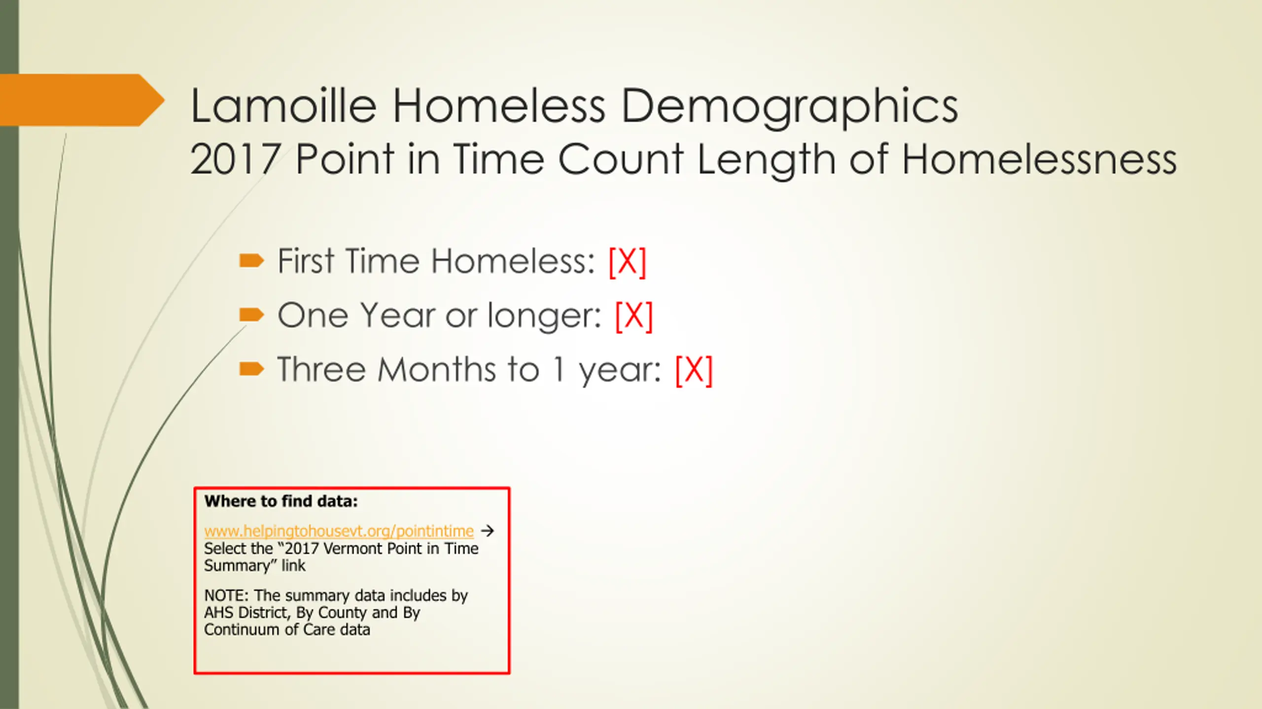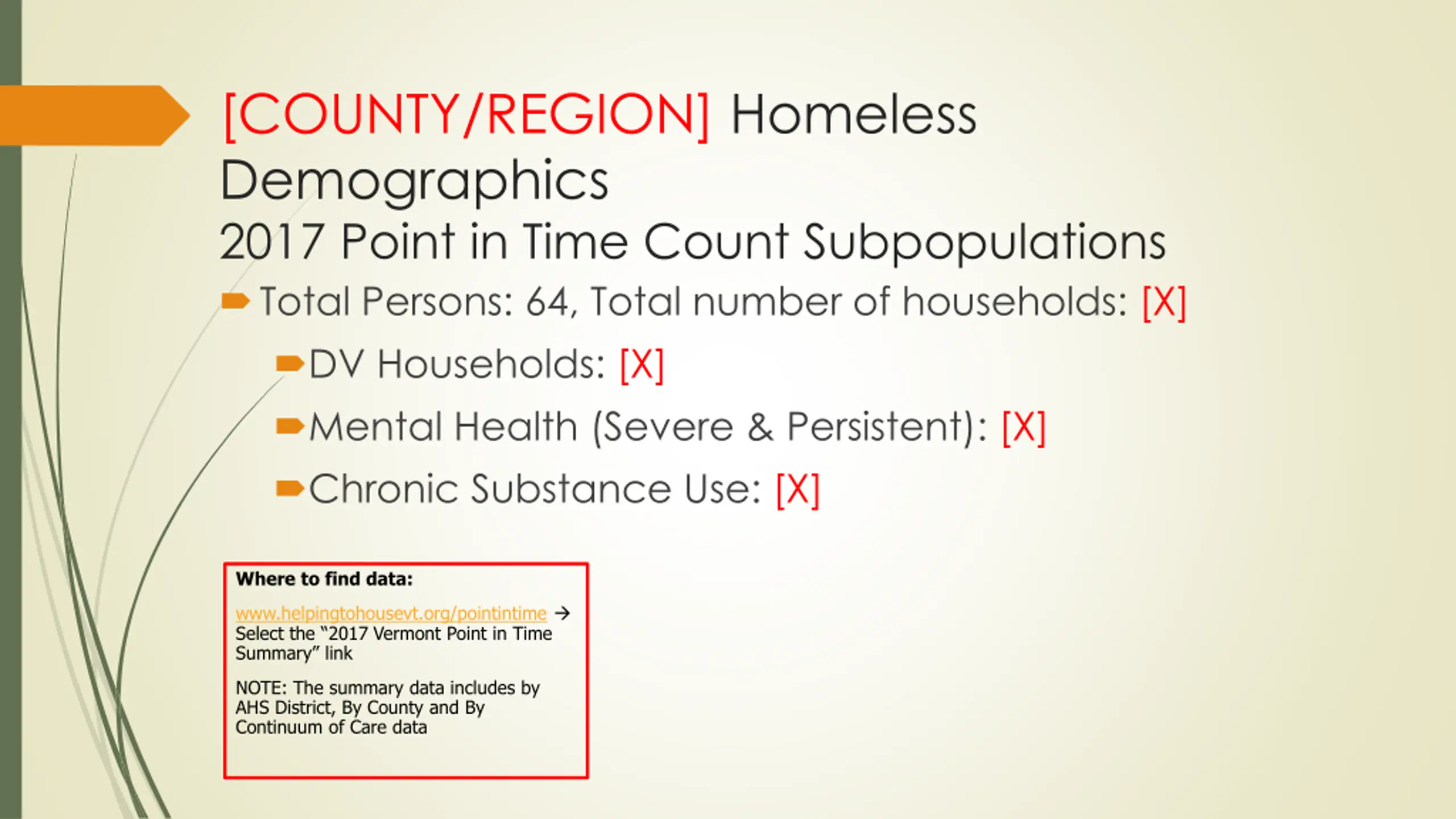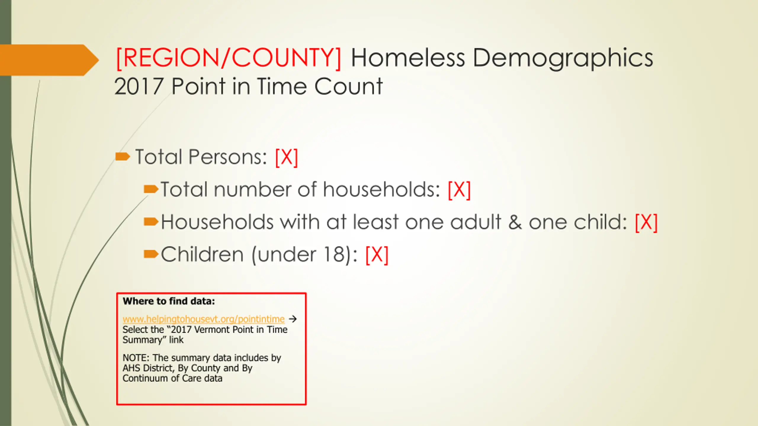 [REGION/COUNTY] Homeless Demographics 2017 Point in Time Count Total Persons:[X] Total number of households: [X] Households with at least one adult & one child: [X] Children (under 18): [X] Where to find data: www.helpingtohousevt.org/pointintime Select the 2017 Vermont Point in Time Summary link NOTE: The summary data includes by AHS District, By County and By Continuum of Care data