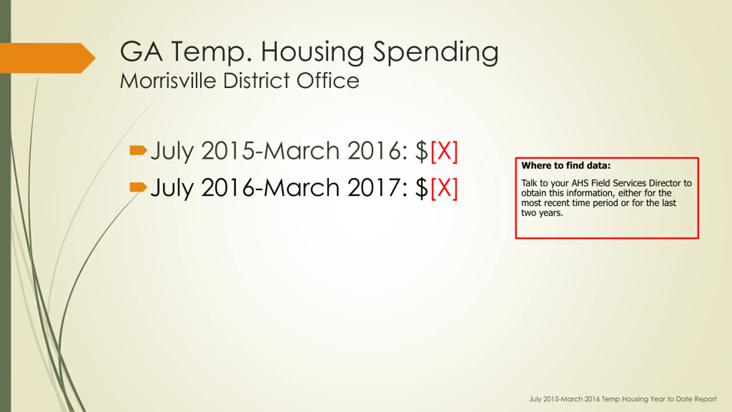 GA Temp. Housing Spending Morrisville District Office July 2015-March 2016: $[X] July 2016-March 2017: $[X] Where to find data: Talk to your AHS Field Services Director to obtain this information, either for the most recent time period or for the last two years. July 2015-March 2016 Temp Housing Year to Date Report