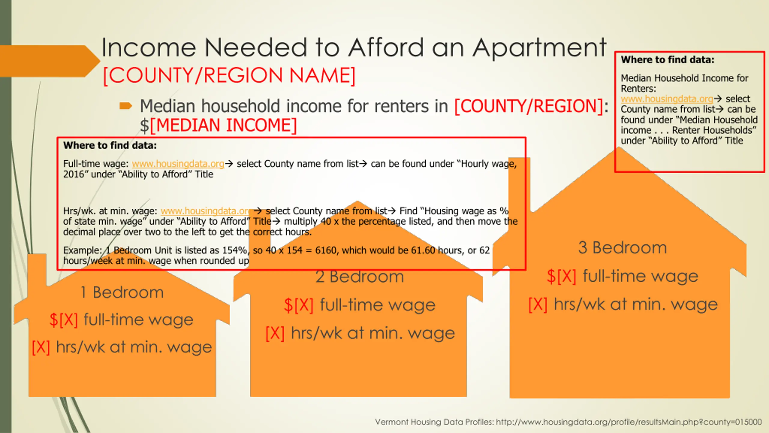 Income Needed to Afford an Apartment [COUNTY/REGION NAME] Median household income for renters in [COUNTY/REGION]: $[MEDIAN INCOME] Where to find data: Where to find data: Median Household Income for Renters: www.housingdata.org select County name from list can be found under Median Household income . . . Renter Households under Ability to Afford Title Full-time wage: www.housingdata.org select County name from list can be found under Hourly wage, 2016 under Ability to Afford Title Hrs/wk. at min. wage: www.housingdata.org select County name from list Find Housing wage as % of state min. wage under Ability to Afford Title multiply 40 x the percentage listed, and then move the decimal place over two to the left to get the correct hours. 3 Bedroom $[X] full-time wage [X] hrs/wk at min. wage Example: 1 Bedroom Unit is listed as 154%, so 40 x 154 = 6160, which would be 61.60 hours, or 62 hours/week at min. wage when rounded up 2 Bedroom $[X] full-time wage [X] hrs/wk at min. wage 1 Bedroom $[X] full-time wage [X] hrs/wk at min. wage Vermont Housing Data Profiles: http://www.housingdata.org/profile/resultsMain.php?county=015000