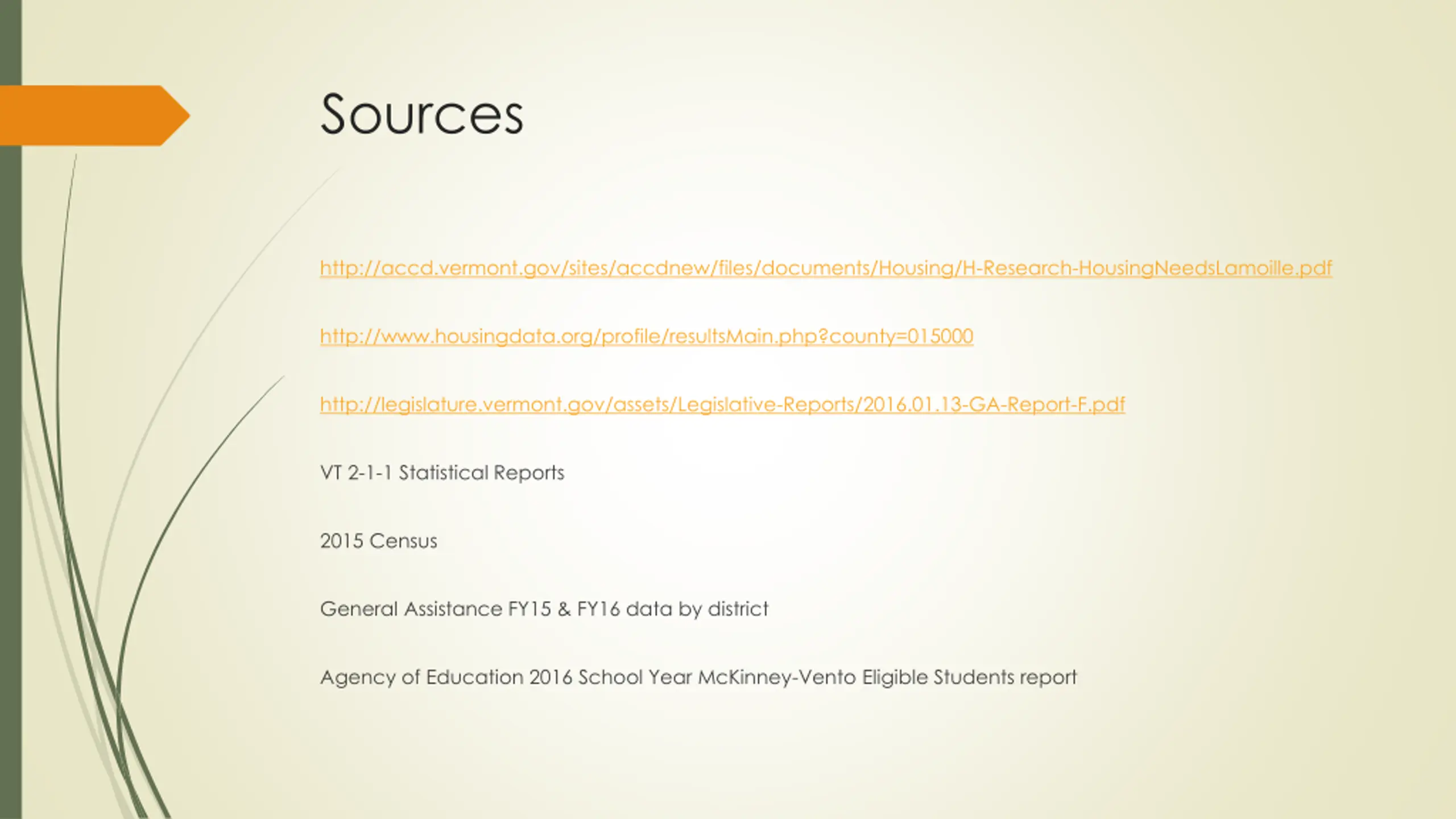 Sources http://accd.vermont.gov/sites/accdnew/files/documents/Housing/H-Research-HousingNeedsLamoille.pdf http://www.housingdata.org/profile/resultsMain.php?county=015000 http://legislature.vermont.gov/assets/Legislative-Reports/2016.01.13-GA-Report-F.pdf VT 2-1-1 Statistical Reports 2015 Census General Assistance FY15 & FY16 data by district Agency of Education 2016 School Year McKinney-Vento Eligible Students report