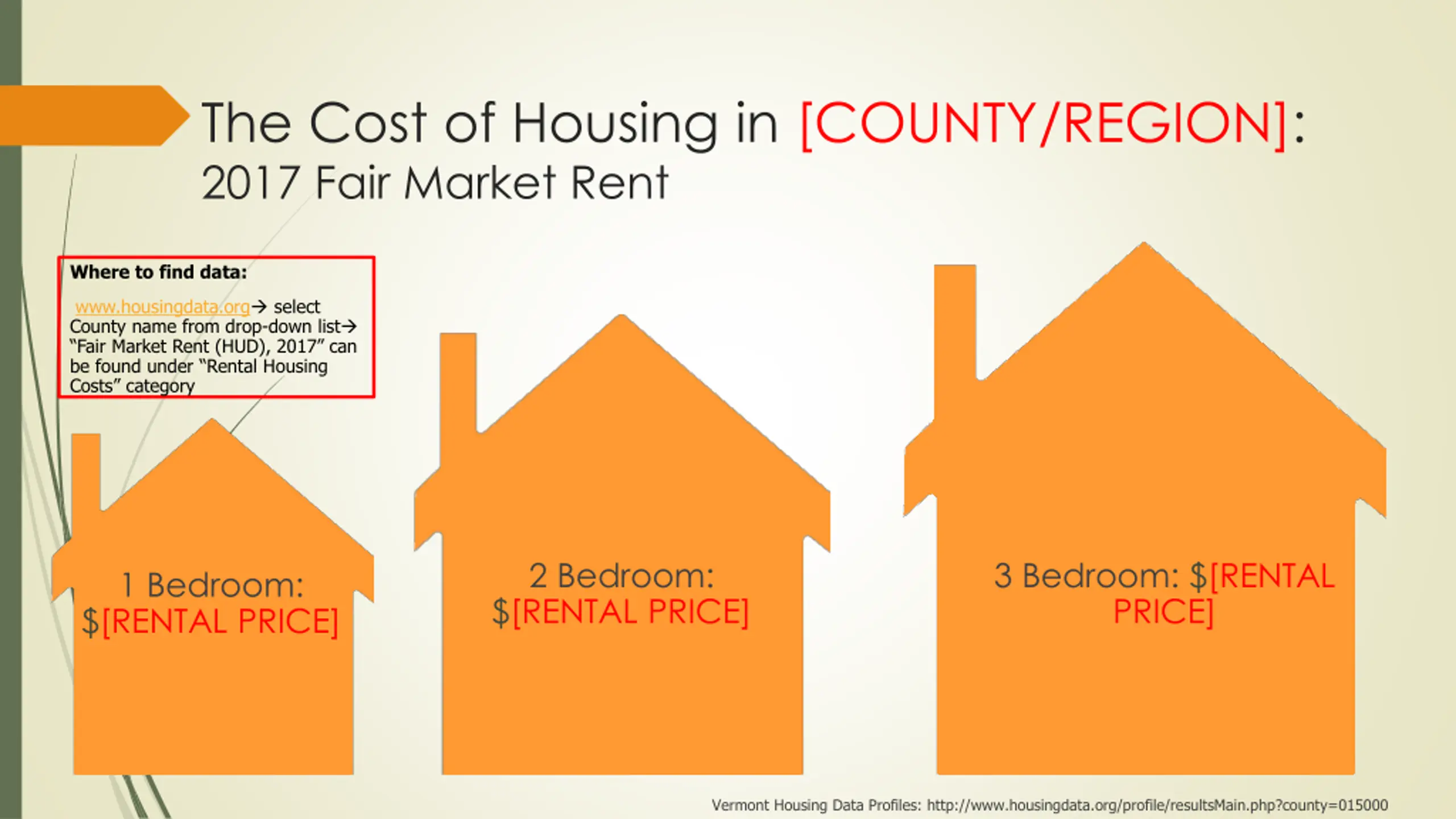 The Cost of Housing in [COUNTY/REGION]: 2017 Fair Market Rent Where to find data: www.housingdata.org select County name from drop-down list Fair Market Rent (HUD), 2017 can be found under Rental Housing Costs category 2 Bedroom: $[RENTAL PRICE] 3 Bedroom: $[RENTAL PRICE] 1 Bedroom: $[RENTAL PRICE] Vermont Housing Data Profiles: http://www.housingdata.org/profile/resultsMain.php?county=015000