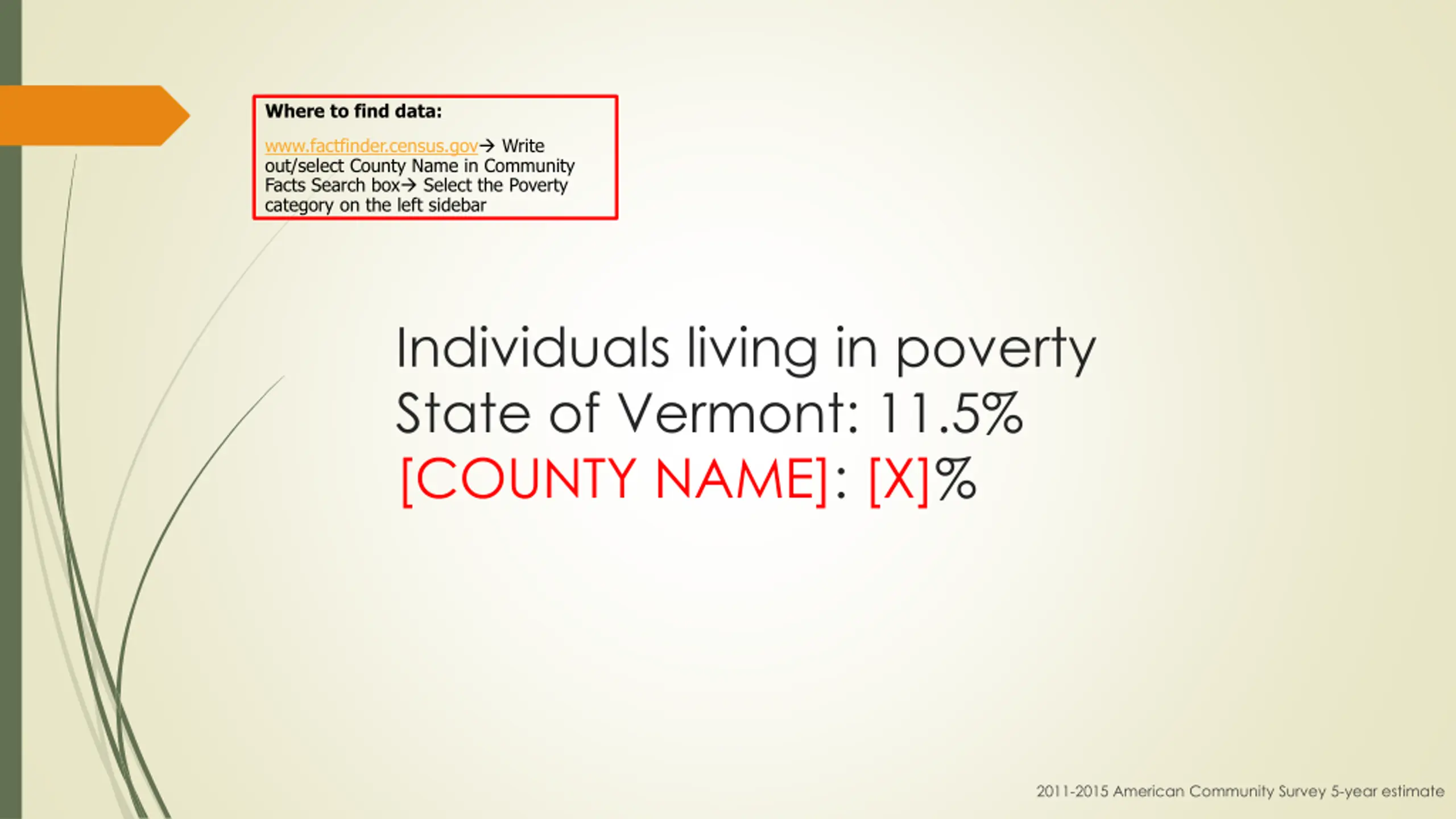Where to find data: www.factfinder.census.gov Write out/select County Name in Community Facts Search box Select the Poverty category on the left sidebar Individuals living in poverty State of Vermont: 11.5% [COUNTY NAME]: [X]% 2011-2015 American Community Survey 5-year estimate