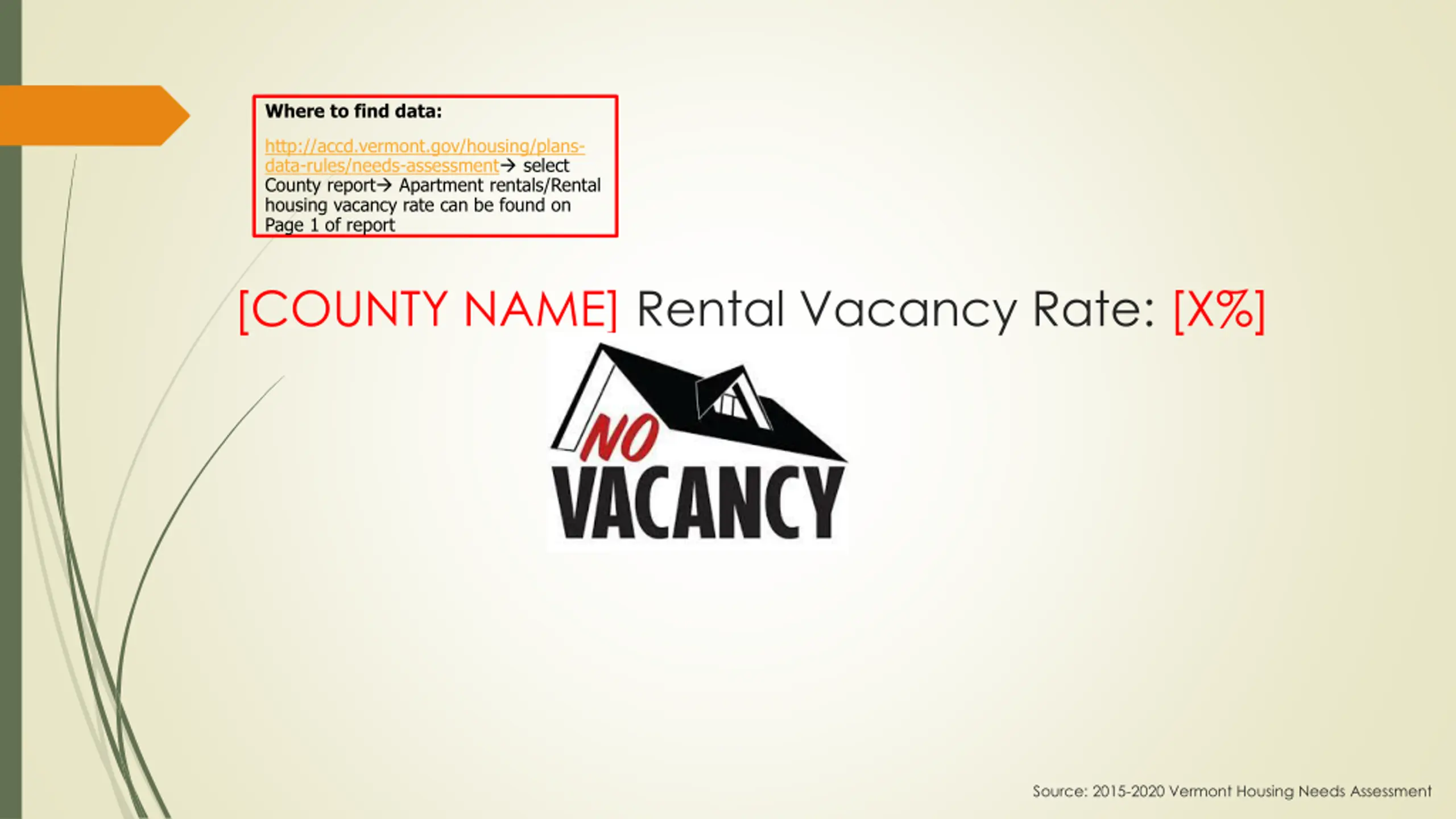 Where to find data: http://accd.vermont.gov/housing/plans- data-rules/needs-assessment select County report Apartment rentals/Rental housing vacancy rate can be found on Page 1 of report [COUNTY NAME] Rental Vacancy Rate: [X%] Source: 2015-2020 Vermont Housing Needs Assessment