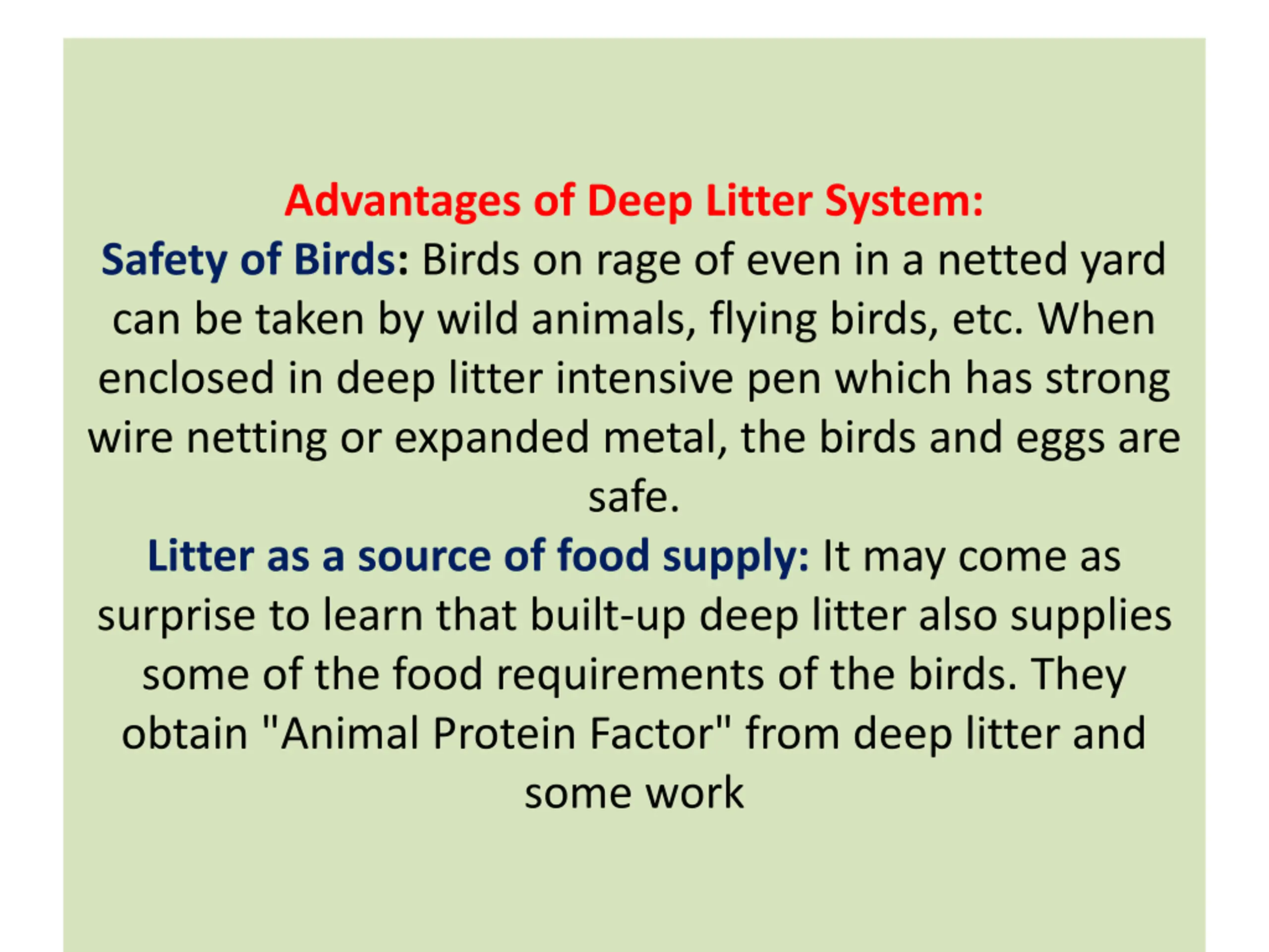 Advantages of Deep Litter System: Safety of Birds: Birds on rage of even in a netted yard can be taken by wild animals, flying birds, etc. When enclosed in deep litter intensive pen which has strong wire netting or expanded metal, the birds and eggs are safe. Litter as a source of food supply: It may come as surprise to learn that built-up deep litter also supplies some of the food requirements of the birds. They obtain "Animal Protein Factor" from deep litter and some work