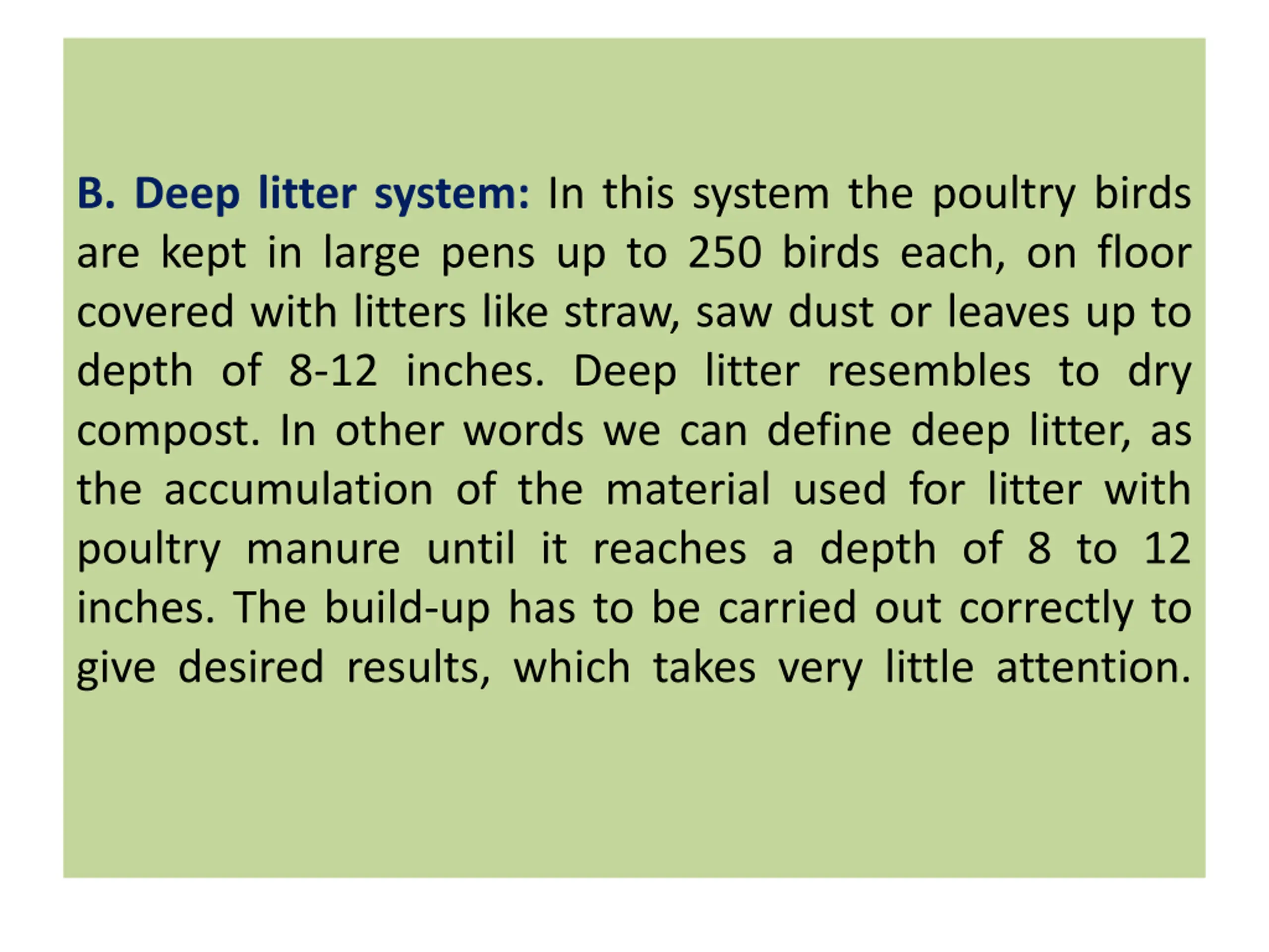 B. Deep litter system: In this system the poultry birds are kept in large pens up to 250 birds each, on floor covered with litters like straw, saw dust or leaves up to depth of 8-12 inches. Deep litter resembles to dry compost. In other words we can define deep litter, as the accumulation of the material used for litter with poultry manure until it reaches a depth of 8 to 12 inches. The build-up has to be carried out correctly to give desired results, which takes very little attention.