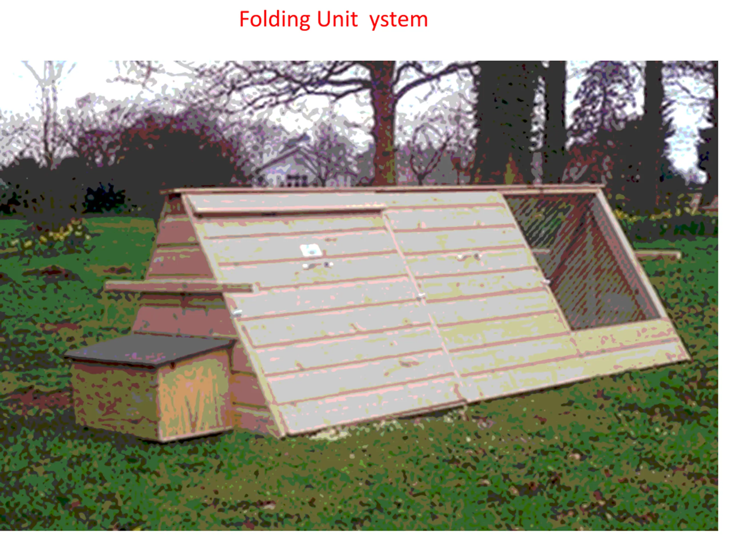 Folding unit System: This system of housing is an innovation of recent years. In portable folding unit s birds being confined to one small run, the position is changed each day, giving them fresh ground and the birds find a considerable proportion of food from the herbage are healthier and harder