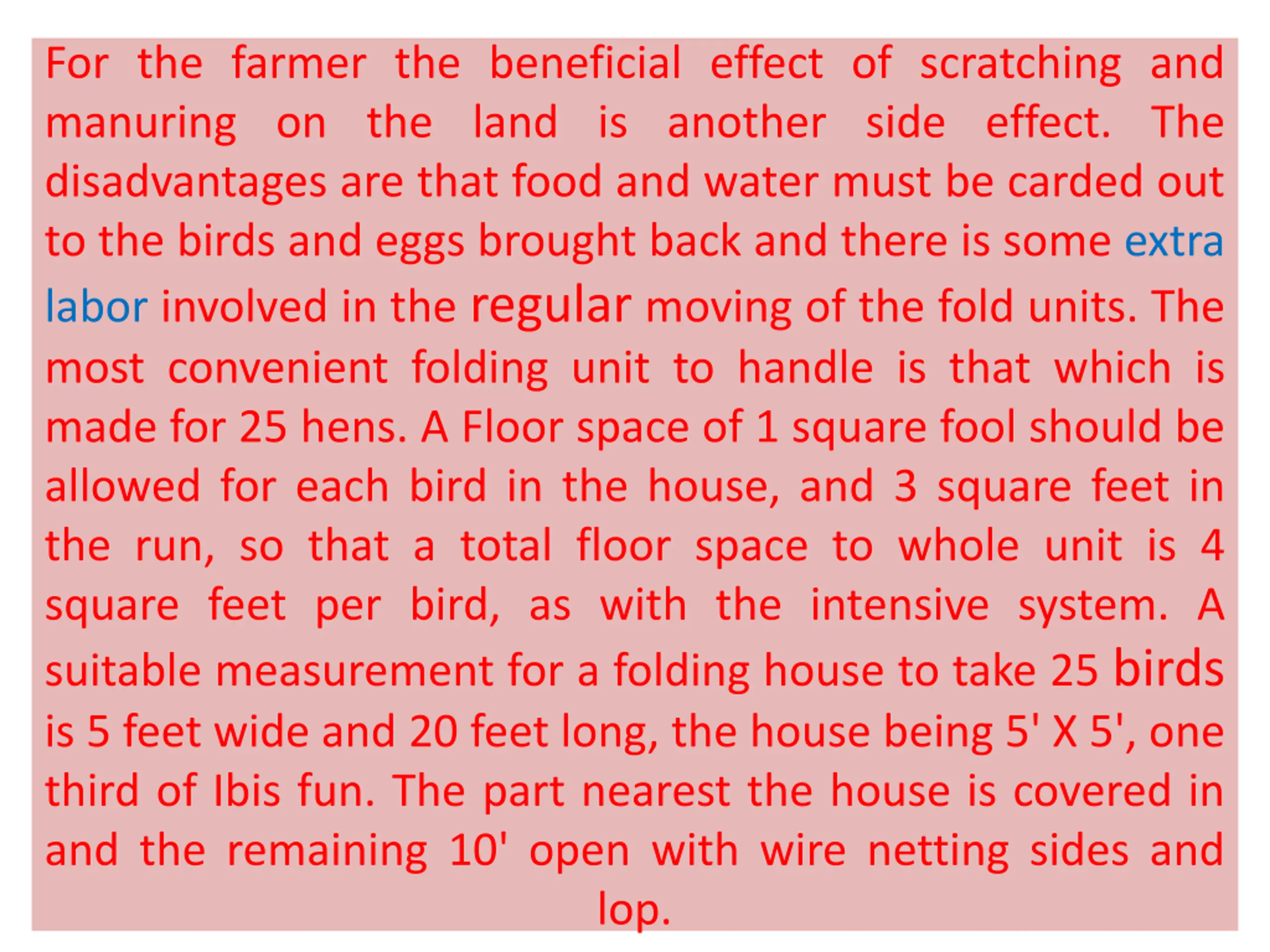 For the farmer the beneficial effect of scratching and manuring on the land is another side effect. The disadvantages are that food and water must be carded out to the birds and eggs brought back and there is some extra labor involved in the regular moving of the fold units. The most convenient folding unit to handle is that which is made for 25 hens. A Floor space of 1 square fool should be allowed for each bird in the house, and 3 square feet in the run, so that a total floor space to whole unit is 4 square feet per bird, as with the intensive system. A suitable measurement for a folding house to take 25 birds is 5 feet wide and 20 feet long, the house being 5' X 5', one third of Ibis fun. The part nearest the house is covered in and the remaining 10' open with wire netting sides and lop.