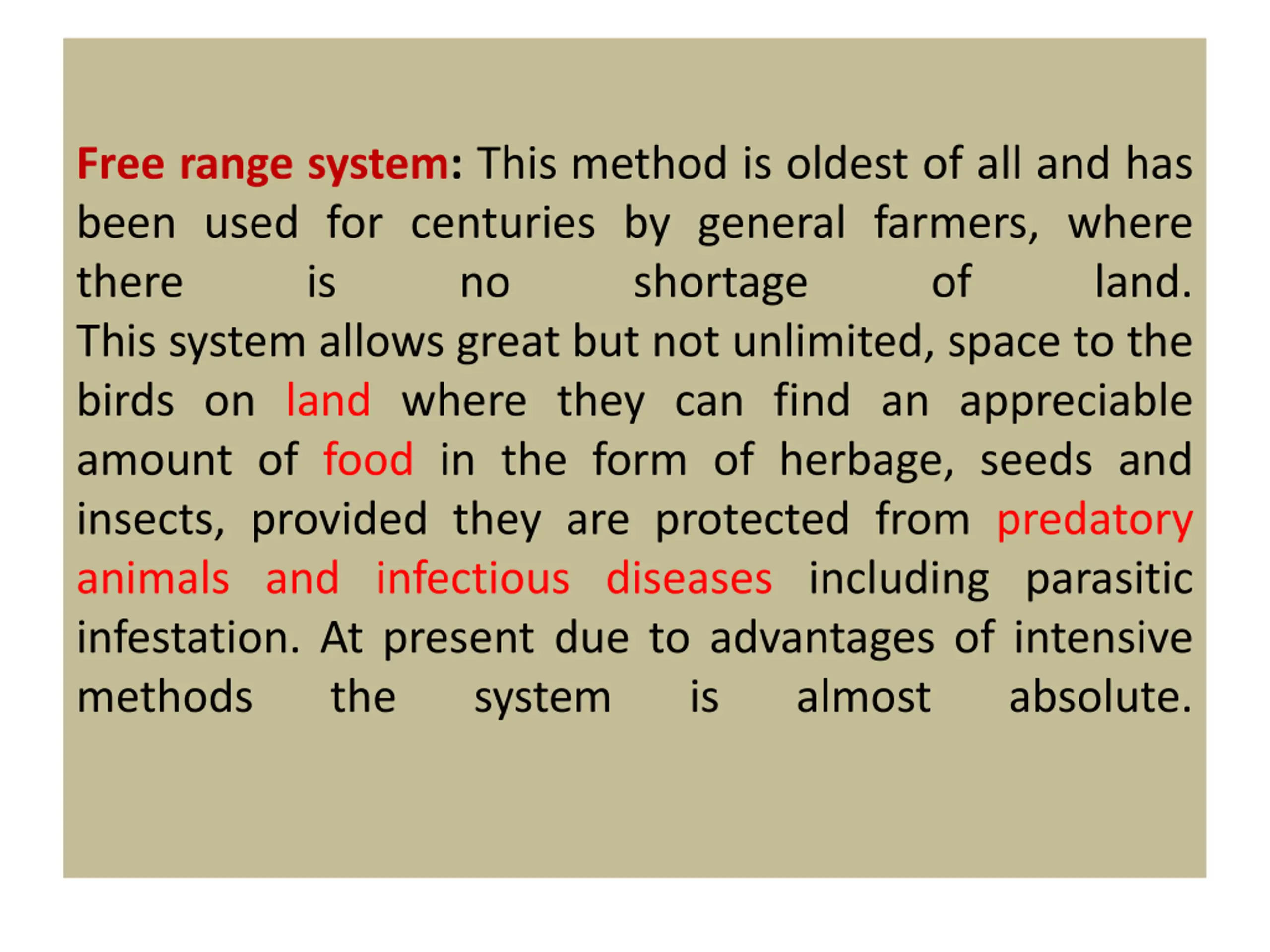 Free range system: This method is oldest of all and has been used for centuries by general farmers, where there is no shortage This system allows great but not unlimited, space to the birds on land where they can find an appreciable amount of food in the form of herbage, seeds and insects, provided they are protected from predatory animals and infectious diseases including parasitic infestation. At present due to advantages of intensive methods the system of land. is almost absolute.
