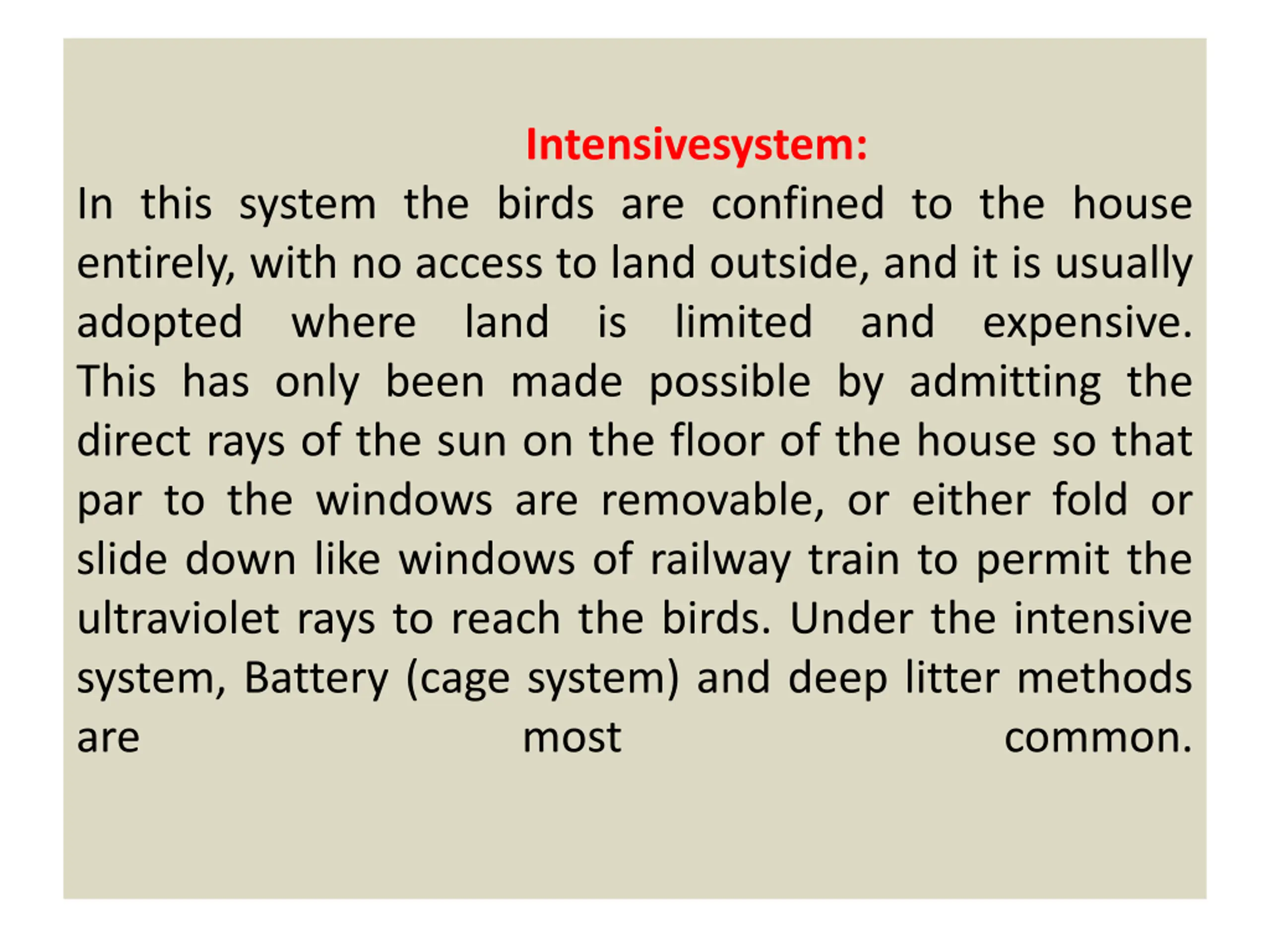 Intensivesystem: In this system the birds are confined to the house entirely, with no access to land outside, and it is usually adopted where land is limited and expensive. This has only been made possible by admitting the direct rays of the sun on the floor of the house so that par to the windows are removable, or either fold or slide down like windows of railway train to permit the ultraviolet rays to reach the birds. Under the intensive system, Battery (cage system) and deep litter methods are most common.