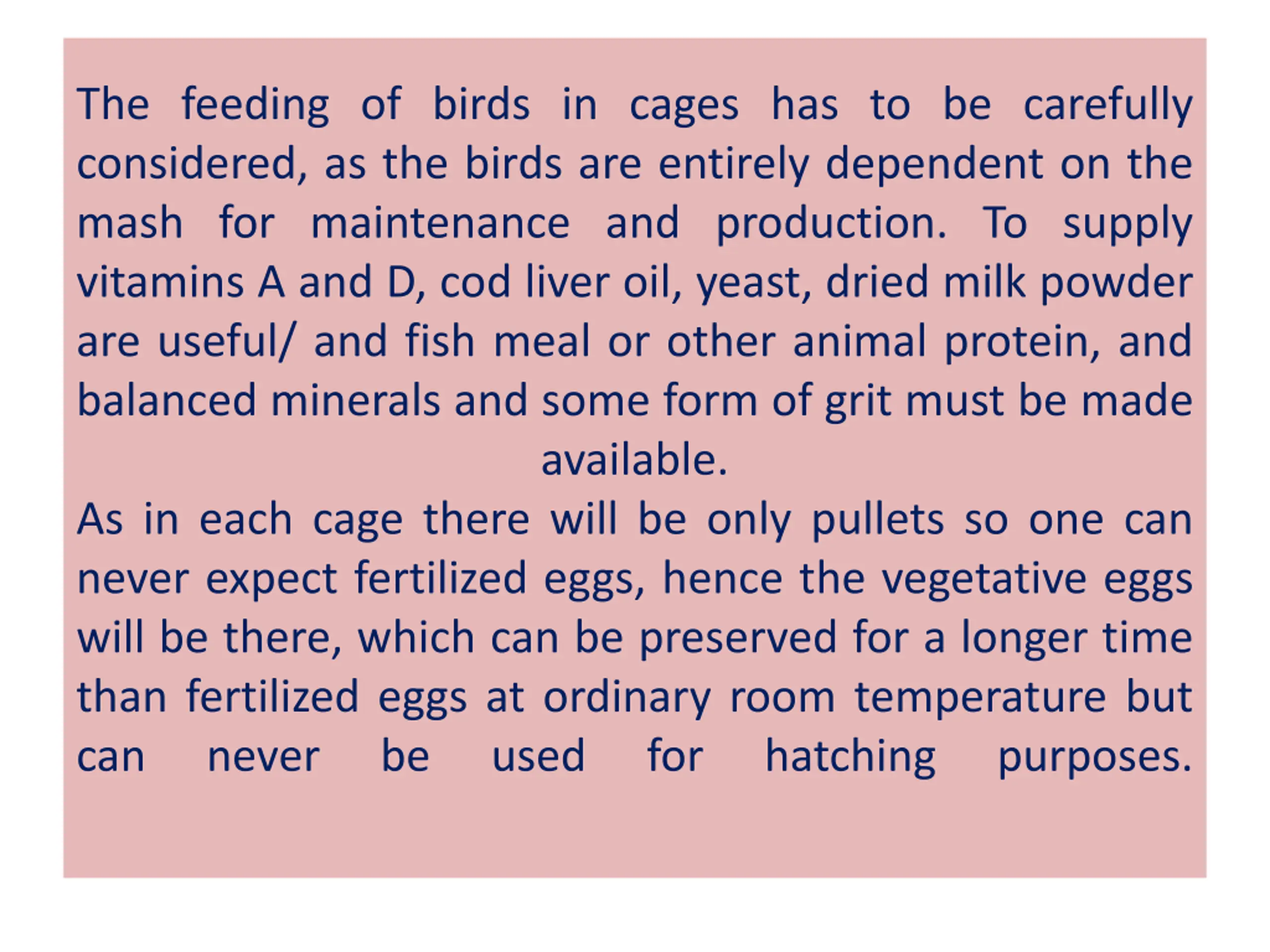 The feeding of birds in cages has to be carefully considered, as the birds are entirely dependent on the mash for maintenance and production. To supply vitamins A and D, cod liver oil, yeast, dried milk powder are useful/ and fish meal or other animal protein, and balanced minerals and some form of grit must be made available. As in each cage there will be only pullets so one can never expect fertilized eggs, hence the vegetative eggs will be there, which can be preserved for a longer time than fertilized eggs at ordinary room temperature but can never be used for hatching purposes.