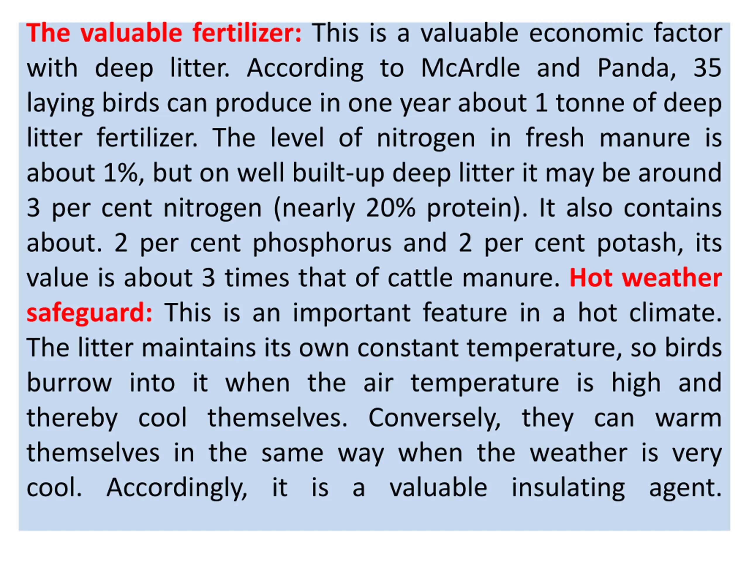 The valuable fertilizer: This is a valuable economic factor with deep litter. According to McArdle and Panda, 35 laying birds can produce in one year about 1 tonne of deep litter fertilizer. The level of nitrogen in fresh manure is about 1%, but on well built-up deep litter it may be around 3 per cent nitrogen (nearly 20% protein). It also contains about. 2 per cent phosphorus and 2 per cent potash, its value is about 3 times that of cattle manure. Hot weather safeguard: This is an important feature in a hot climate. The litter maintains its own constant temperature, so birds burrow into it when the air temperature is high and thereby cool themselves. Conversely, they can warm themselves in the same way when the weather is very cool. Accordingly, it is a valuable insulating agent.