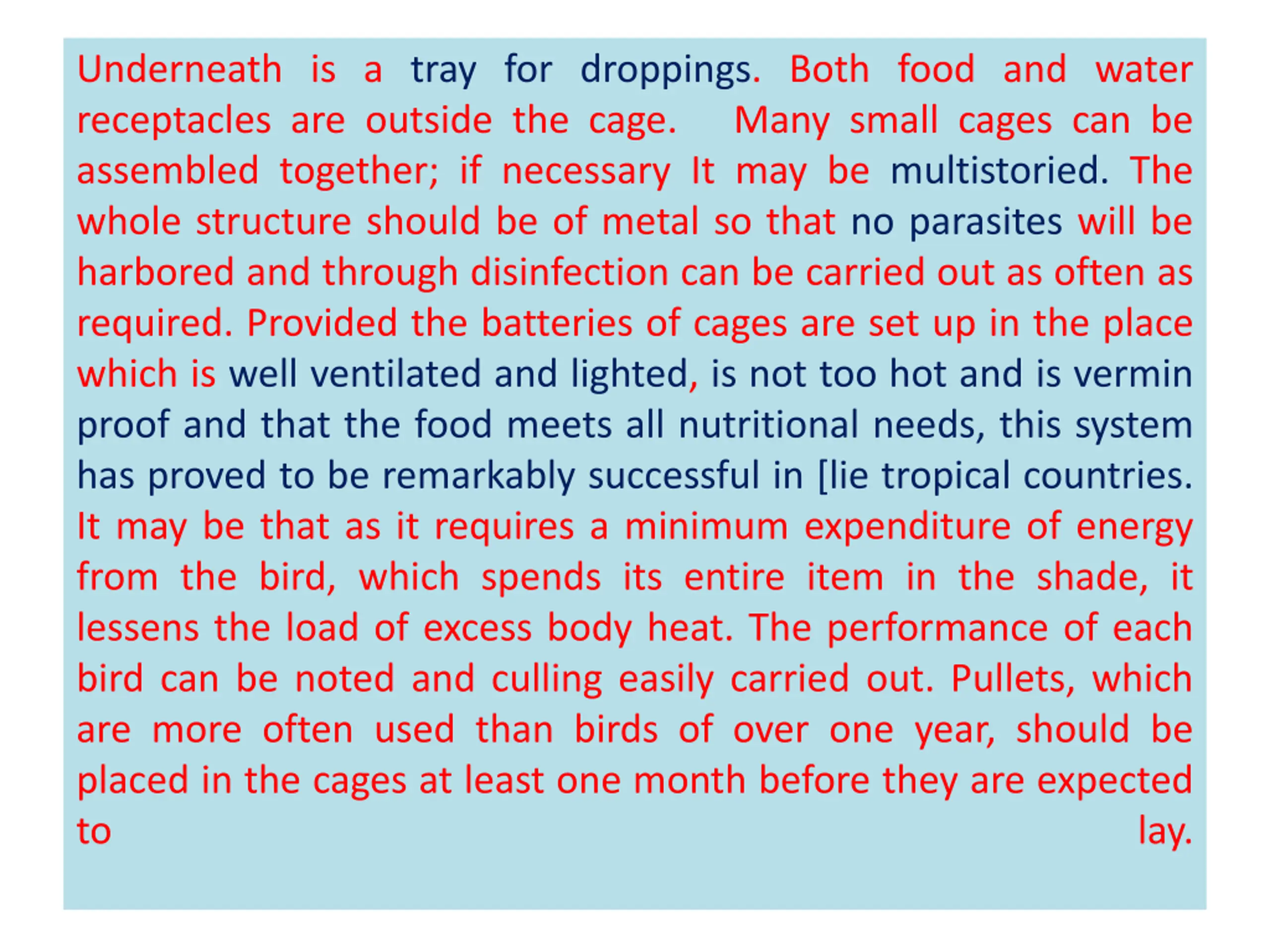 Underneath is a tray for droppings. Both food and water receptacles are outside the cage. Many small cages can be assembled together; if necessary It may be multistoried. The whole structure should be of metal so that no parasites will be harbored and through disinfection can be carried out as often as required. Provided the batteries of cages are set up in the place which is well ventilated and lighted, is not too hot and is vermin proof and that the food meets all nutritional needs, this system has proved to be remarkably successful in [lie tropical countries. It may be that as it requires a minimum expenditure of energy from the bird, which spends its entire item in the shade, it lessens the load of excess body heat. The performance of each bird can be noted and culling easily carried out. Pullets, which are more often used than birds of over one year, should be placed in the cages at least one month before they are expected to lay.