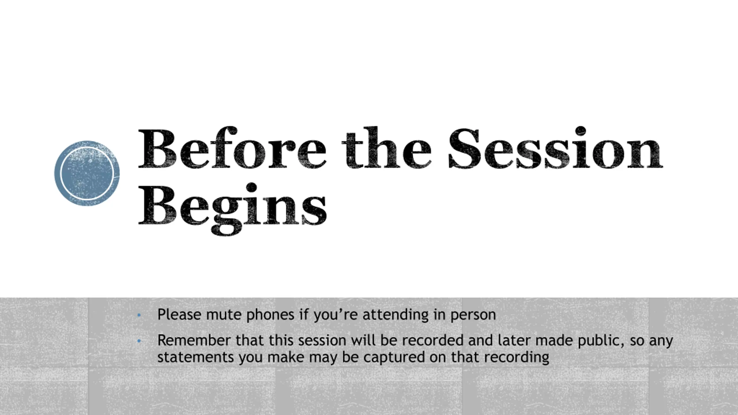 Before the Session Begins Please mute phones if you re attending in person Remember that this session will be recorded and later made public, so any statements you make may be captured on that recording
