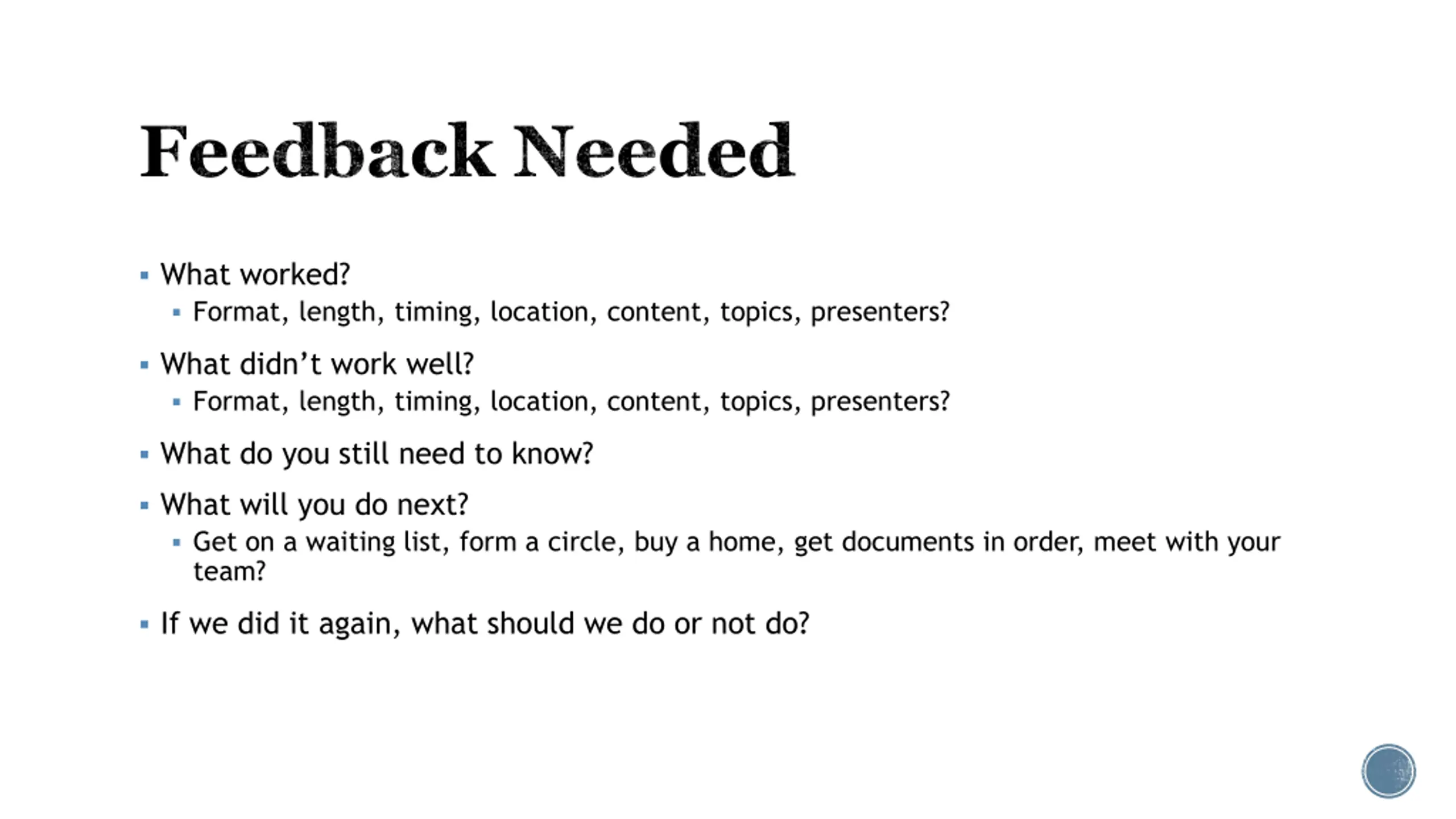 Feedback Needed What worked? Format, length, timing, location, content, topics, presenters? What didn t work well? Format, length, timing, location, content, topics, presenters? What do you still need to know? What will you do next? Get on a waiting list, form a circle, buy a home, get documents in order, meet with your team? If we did it again, what should we do or not do?