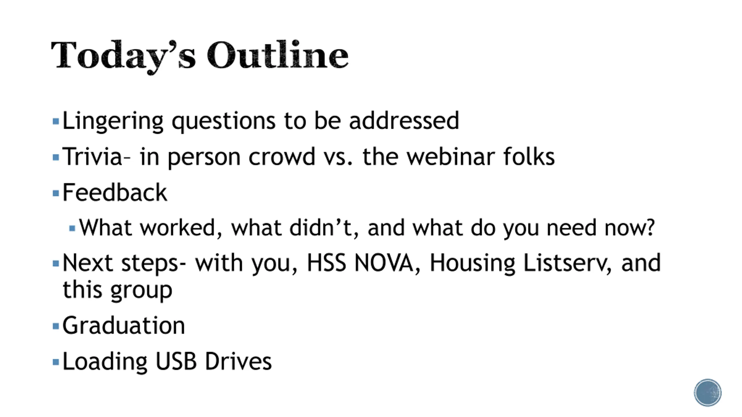 Todays Outline Lingering questions to be addressed Trivia in person crowd vs. the webinar folks Feedback What worked, what didn t, and what do you need now? Next steps- with you, HSS NOVA, Housing Listserv, and this group Graduation Loading USB Drives