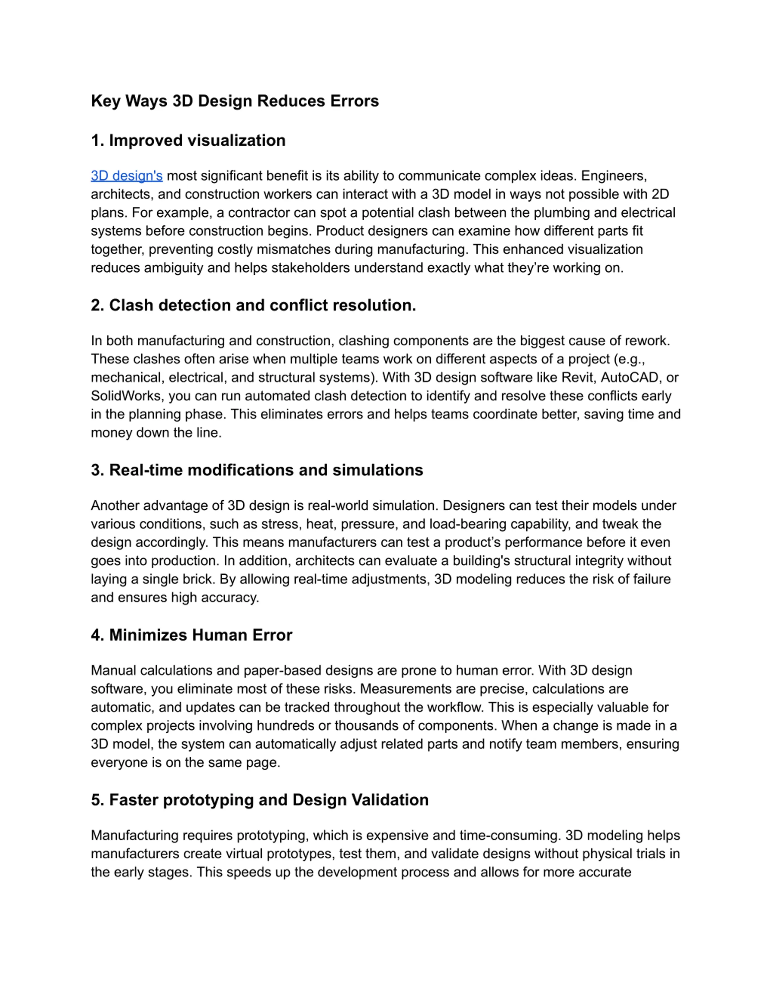 Key Ways 3D Design Reduces Errors 1. Improved visualization 3D design's most significant benefit is its ability to communicate complex ideas. Engineers, architects, and construction workers can interact with a 3D model in ways not possible with 2D plans. For example, a contractor can spot a potential clash between the plumbing and electrical systems before construction begins. Product designers can examine how different parts fit together, preventing costly mismatches during manufacturing. This enhanced visualization reduces ambiguity and helps stakeholders understand exactly what they re working on. 2. Clash detection and conflict resolution. In both manufacturing and construction, clashing components are the biggest cause of rework. These clashes often arise when multiple teams work on different aspects of a project (e.g., mechanical, electrical, and structural systems). With 3D design software like Revit, AutoCAD, or SolidWorks, you can run automated clash detection to identify and resolve these conflicts early in the planning phase. This eliminates errors and helps teams coordinate better, saving time and money down the line. 3. Real-time modifications and simulations Another advantage of 3D design is real-world simulation. Designers can test their models under various conditions, such as stress, heat, pressure, and load-bearing capability, and tweak the design accordingly. This means manufacturers can test a product s performance before it even goes into production. In addition, architects can evaluate a building's structural integrity without laying a single brick. By allowing real-time adjustments, 3D modeling reduces the risk of failure and ensures high accuracy. 4. Minimizes Human Error Manual calculations and paper-based designs are prone to human error. With 3D design software, you eliminate most of these risks. Measurements are precise, calculations are automatic, and updates can be tracked throughout the workflow. This is especially valuable for complex projects involving hundreds or thousands of components. When a change is made in a 3D model, the system can automatically adjust related parts and notify team members, ensuring everyone is on the same page. 5. Faster prototyping and Design Validation Manufacturing requires prototyping, which is expensive and time-consuming. 3D modeling helps manufacturers create virtual prototypes, test them, and validate designs without physical trials in the early stages. This speeds up the development process and allows for more accurate