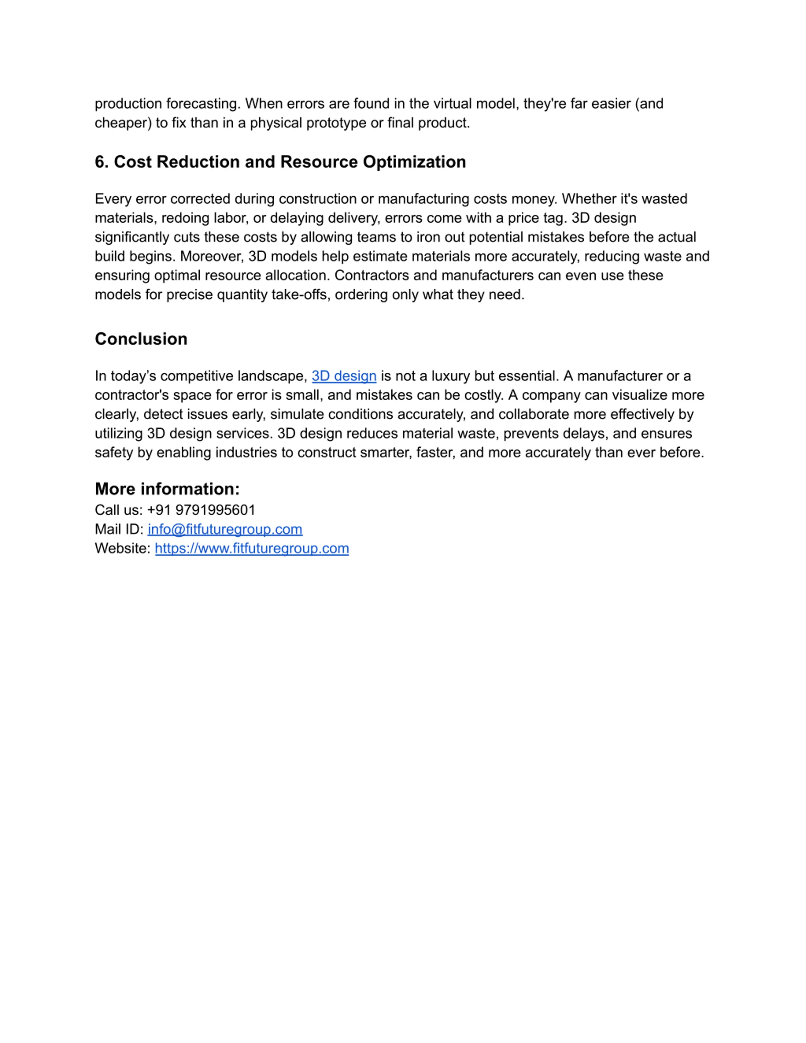 production forecasting. When errors are found in the virtual model, they're far easier (and cheaper) to fix than in a physical prototype or final product. 6. Cost Reduction and Resource Optimization Every error corrected during construction or manufacturing costs money. Whether it's wasted materials, redoing labor, or delaying delivery, errors come with a price tag. 3D design significantly cuts these costs by allowing teams to iron out potential mistakes before the actual build begins. Moreover, 3D models help estimate materials more accurately, reducing waste and ensuring optimal resource allocation. Contractors and manufacturers can even use these models for precise quantity take-offs, ordering only what they need. Conclusion In today s competitive landscape, 3D design is not a luxury but essential. A manufacturer or a contractor's space for error is small, and mistakes can be costly. A company can visualize more clearly, detect issues early, simulate conditions accurately, and collaborate more effectively by utilizing 3D design services. 3D design reduces material waste, prevents delays, and ensures safety by enabling industries to construct smarter, faster, and more accurately than ever before. More information: Call us: +91 9791995601 Mail ID: info@fitfuturegroup.com Website: https://www.fitfuturegroup.com