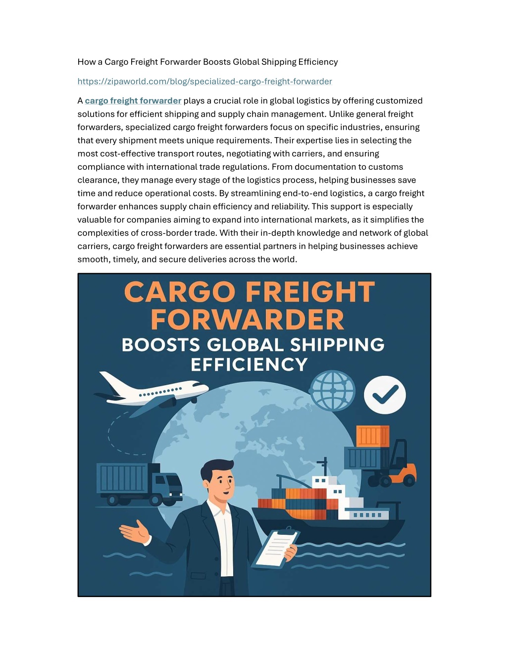 How a Cargo Freight Forwarder Boosts Global Shipping E?iciency https://zipaworld.com/blog/specialized-cargo-freight-forwarder A cargo freight forwarder plays a crucial role in global logistics by o?ering customized solutions for e?icient shipping and supply chain management. Unlike general freight forwarders, specialized cargo freight forwarders focus on specific industries, ensuring that every shipment meets unique requirements. Their expertise lies in selecting the most cost-e?ective transport routes, negotiating with carriers, and ensuring compliance with international trade regulations. From documentation to customs clearance, they manage every stage of the logistics process, helping businesses save time and reduce operational costs. By streamlining end-to-end logistics, a cargo freight forwarder enhances supply chain e?iciency and reliability. This support is especially valuable for companies aiming to expand into international markets, as it simplifies the complexities of cross-border trade. With their in-depth knowledge and network of global carriers, cargo freight forwarders are essential partners in helping businesses achieve smooth, timely, and secure deliveries across the world.