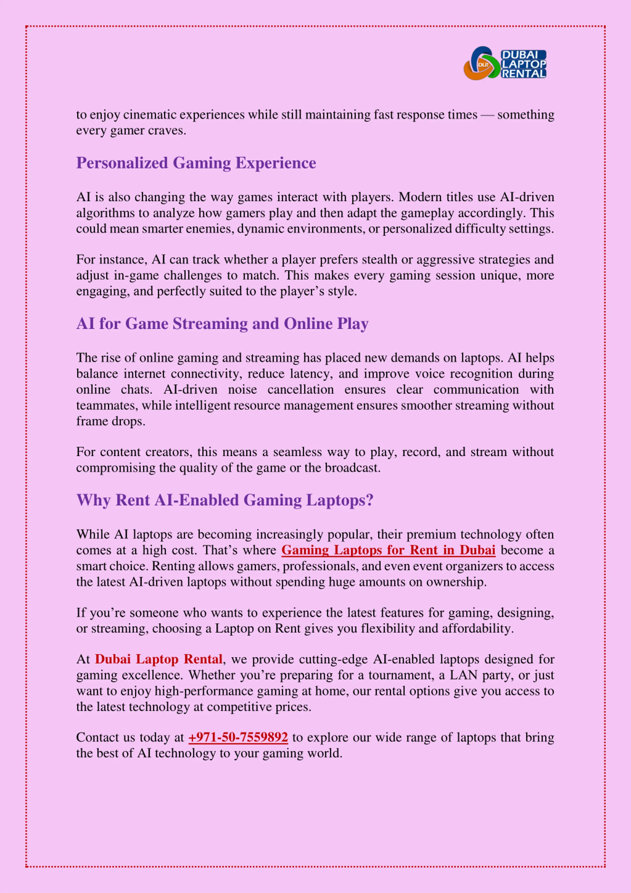 to enjoy cinematic experiences while still maintaining fast response times something every gamer craves. Personalized Gaming Experience AI is also changing the way games interact with players. Modern titles use AI-driven algorithms to analyze how gamers play and then adapt the gameplay accordingly. This could mean smarter enemies, dynamic environments, or personalized difficulty settings. For instance, AI can track whether a player prefers stealth or aggressive strategies and adjust in-game challenges to match. This makes every gaming session unique, more engaging, and perfectly suited to the player s style. AI for Game Streaming and Online Play The rise of online gaming and streaming has placed new demands on laptops. AI helps balance internet connectivity, reduce latency, and improve voice recognition during online chats. AI-driven noise cancellation ensures clear communication with teammates, while intelligent resource management ensures smoother streaming without frame drops. For content creators, this means a seamless way to play, record, and stream without compromising the quality of the game or the broadcast. Why Rent AI-Enabled Gaming Laptops? While AI laptops are becoming increasingly popular, their premium technology often comes at a high cost. That s whereGaming Laptops for Rentin Dubai become a smart choice. Renting allows gamers, professionals, and even event organizers to access the latest AI-driven laptops without spending huge amounts on ownership. If you re someone who wants to experience the latest features for gaming, designing, or streaming, choosing a Laptop on Rent gives you flexibility and affordability. At Dubai Laptop Rental, we provide cutting-edge AI-enabled laptops designed for gaming excellence. Whether you re preparing for a tournament, a LAN party, or just want to enjoy high-performance gaming at home, our rental options give you access to the latest technology at competitive prices. Contact us today at +971-50-7559892 to explore our wide range of laptops that bring the best of AI technology to your gaming world.
