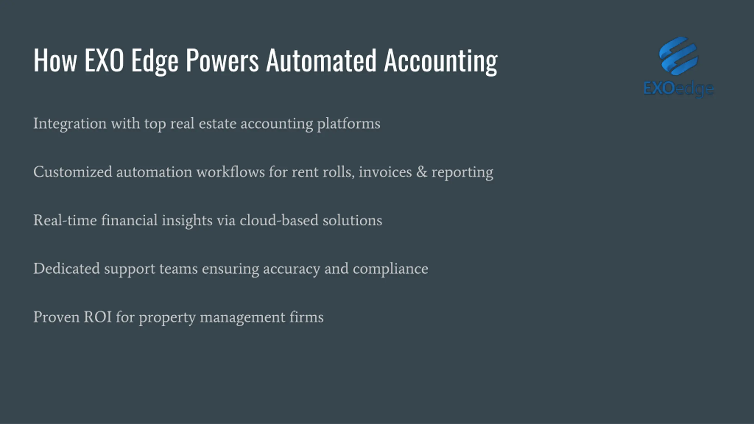 How EXO Edge Powers Automated Accounting Integration with top real estate accounting platforms Customized automation workflows for rent rolls, invoices & reporting Real-time financial insights via cloud-based solutions Dedicated support teams ensuring accuracy and compliance Proven ROI for property management firms