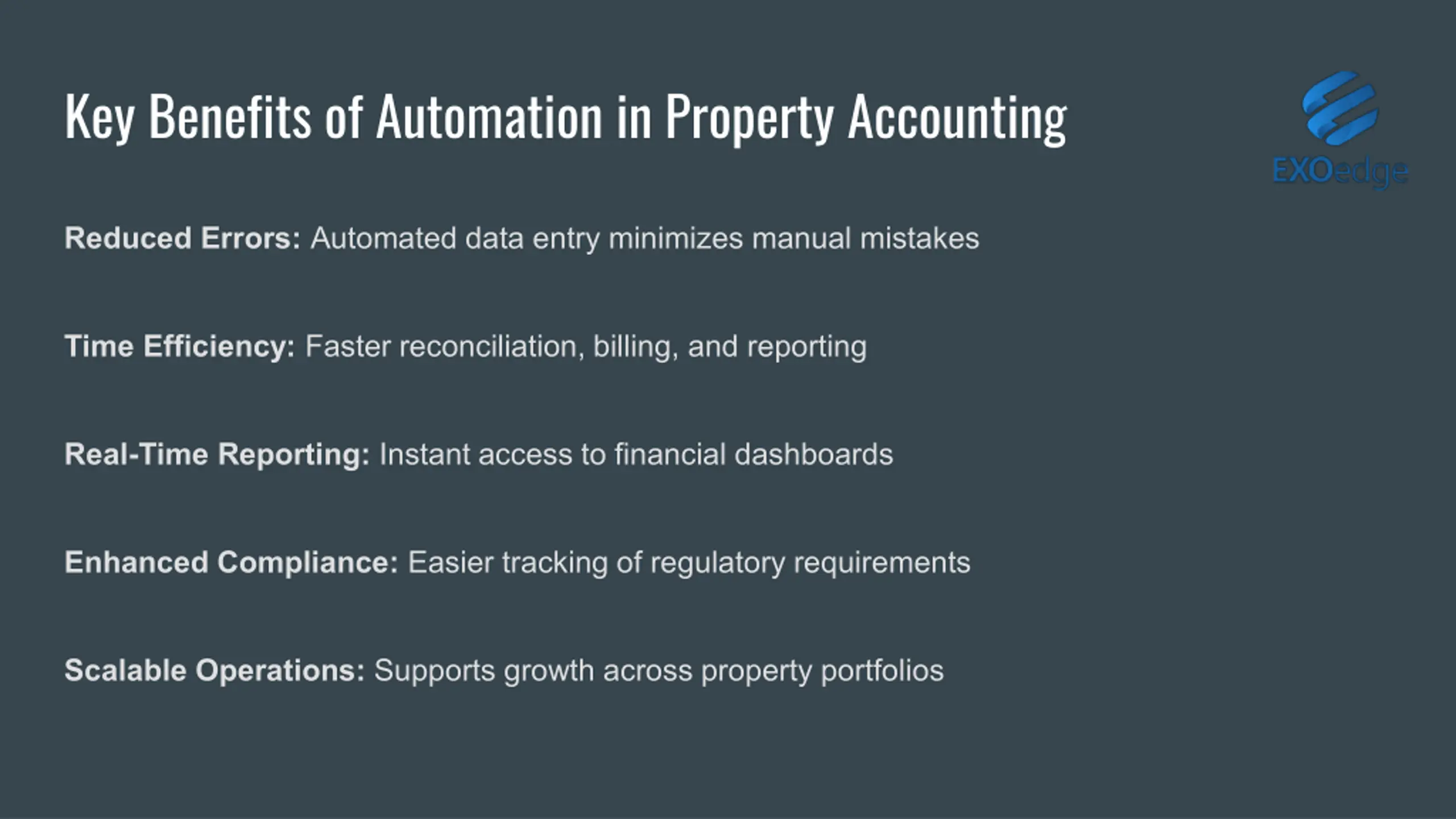 Key Benefits of Automation in Property Accounting Reduced Errors: Automated data entry minimizes manual mistakes Time Efficiency: Faster reconciliation, billing, and reporting Real-Time Reporting: Instant access to financial dashboards Enhanced Compliance: Easier tracking of regulatory requirements Scalable Operations: Supports growth across property portfolios