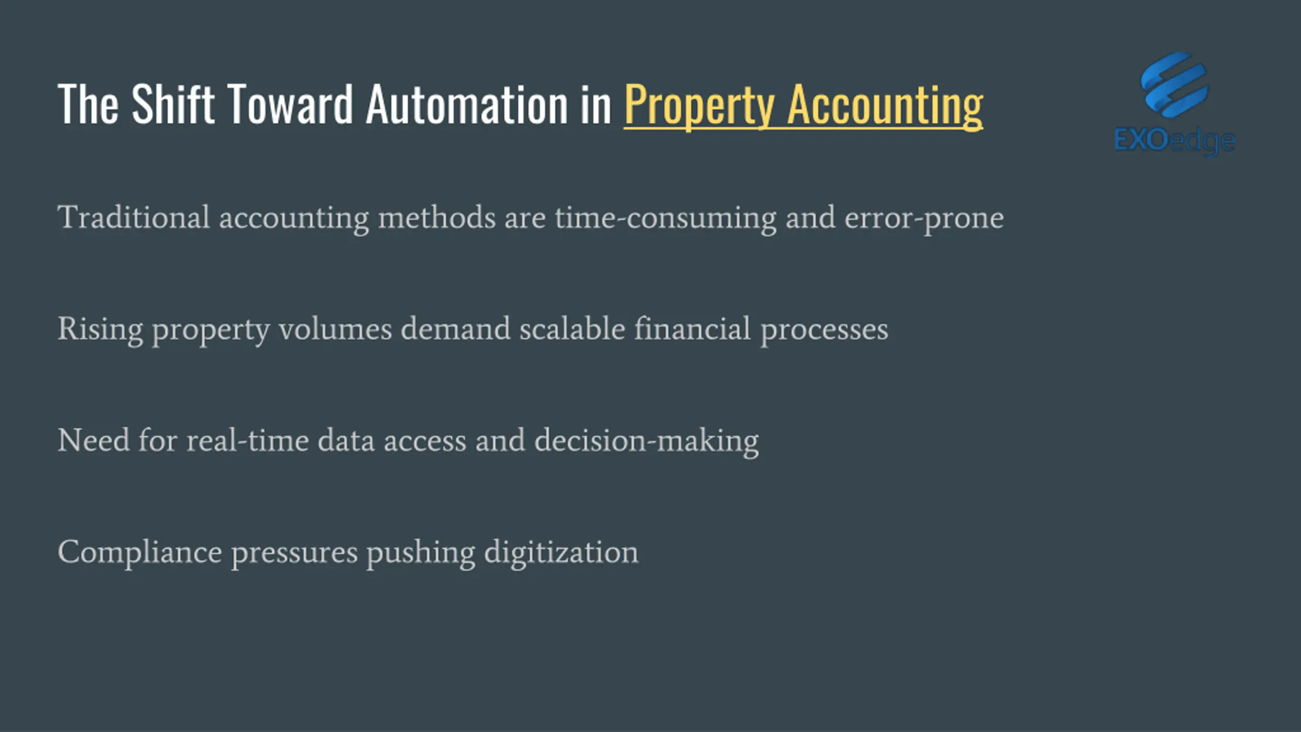 The Shift Toward Automation in Property Accounting Traditional accounting methods are time-consuming and error-prone Rising property volumes demand scalable financial processes Need for real-time data access and decision-making Compliance pressures pushing digitization