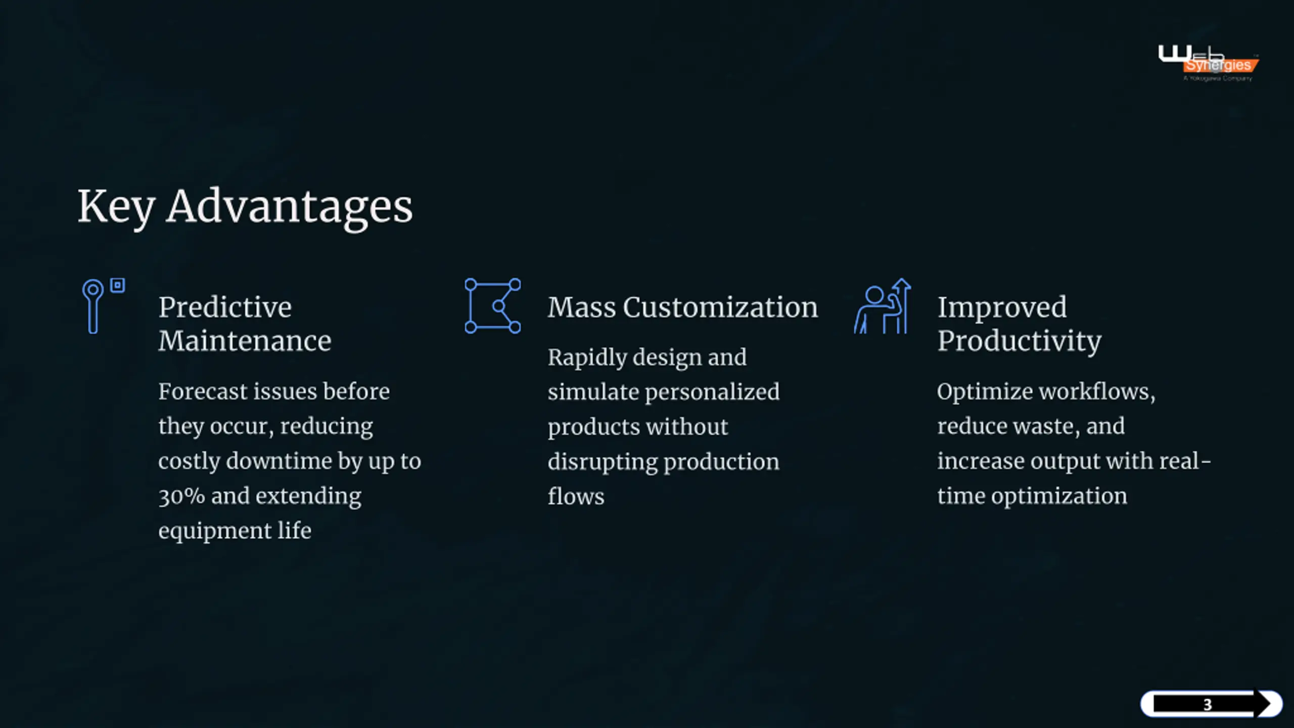 Key Advantages Predictive Maintenance Mass Customization Improved Productivity Rapidly design and simulate personalized products without disrupting production flows Forecast issues before they occur, reducing costly downtime by up to 30% and extending equipment life Optimize workflows, reduce waste, and increase output with real- time optimization preencoded.png 3