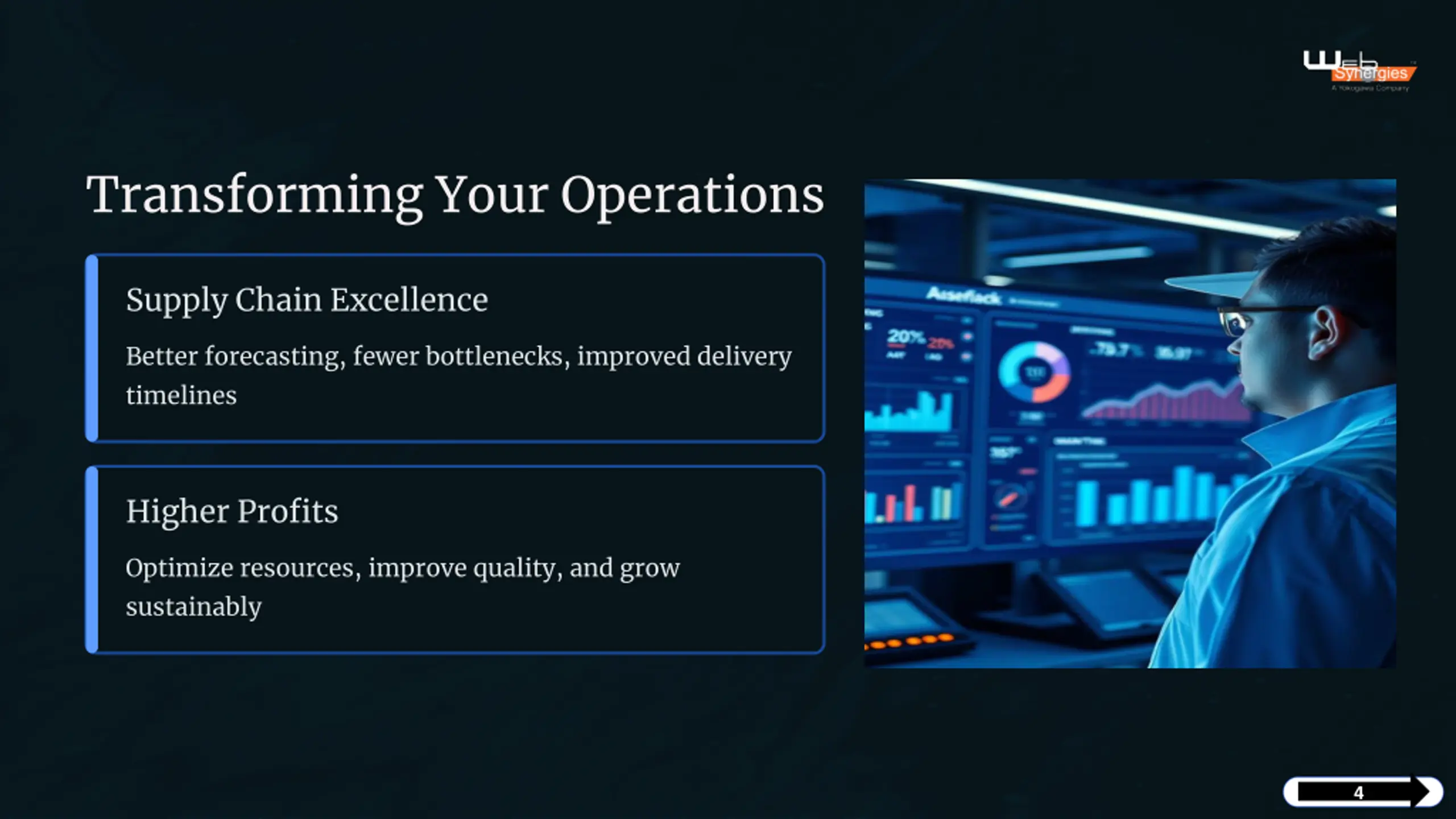 Transforming Your Operations Supply Chain Excellence Better forecasting, fewer bottlenecks, improved delivery timelines Higher Profits Optimize resources, improve quality, and grow sustainably preencoded.png 4