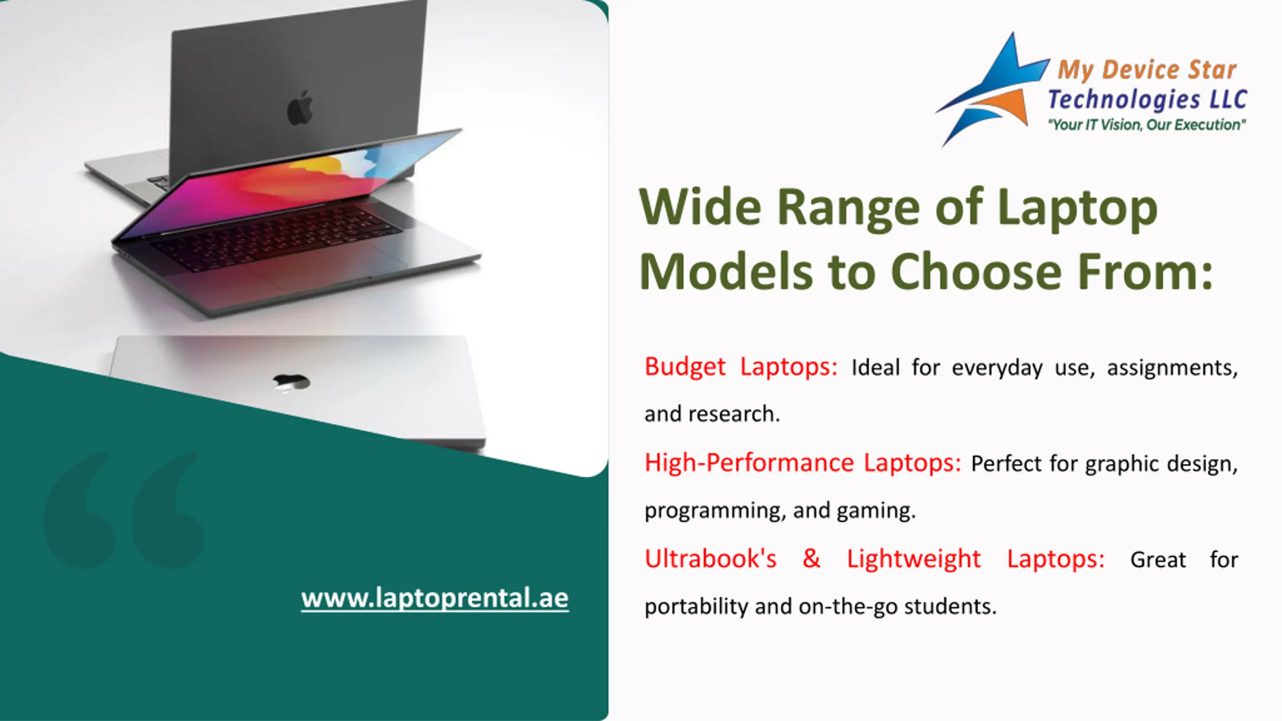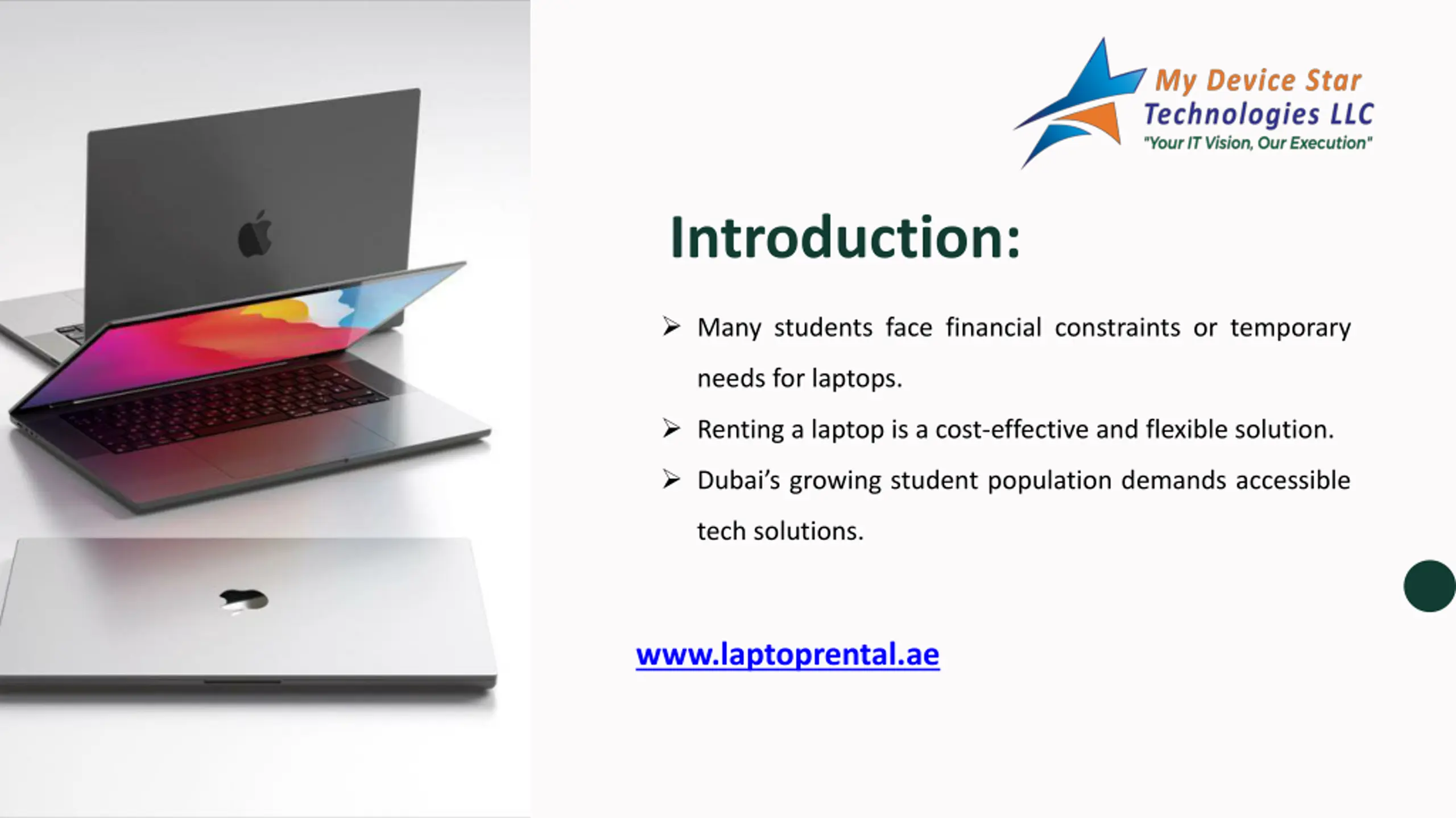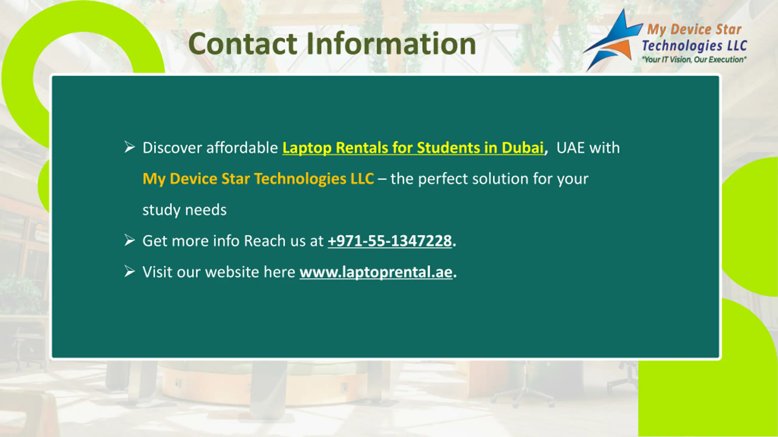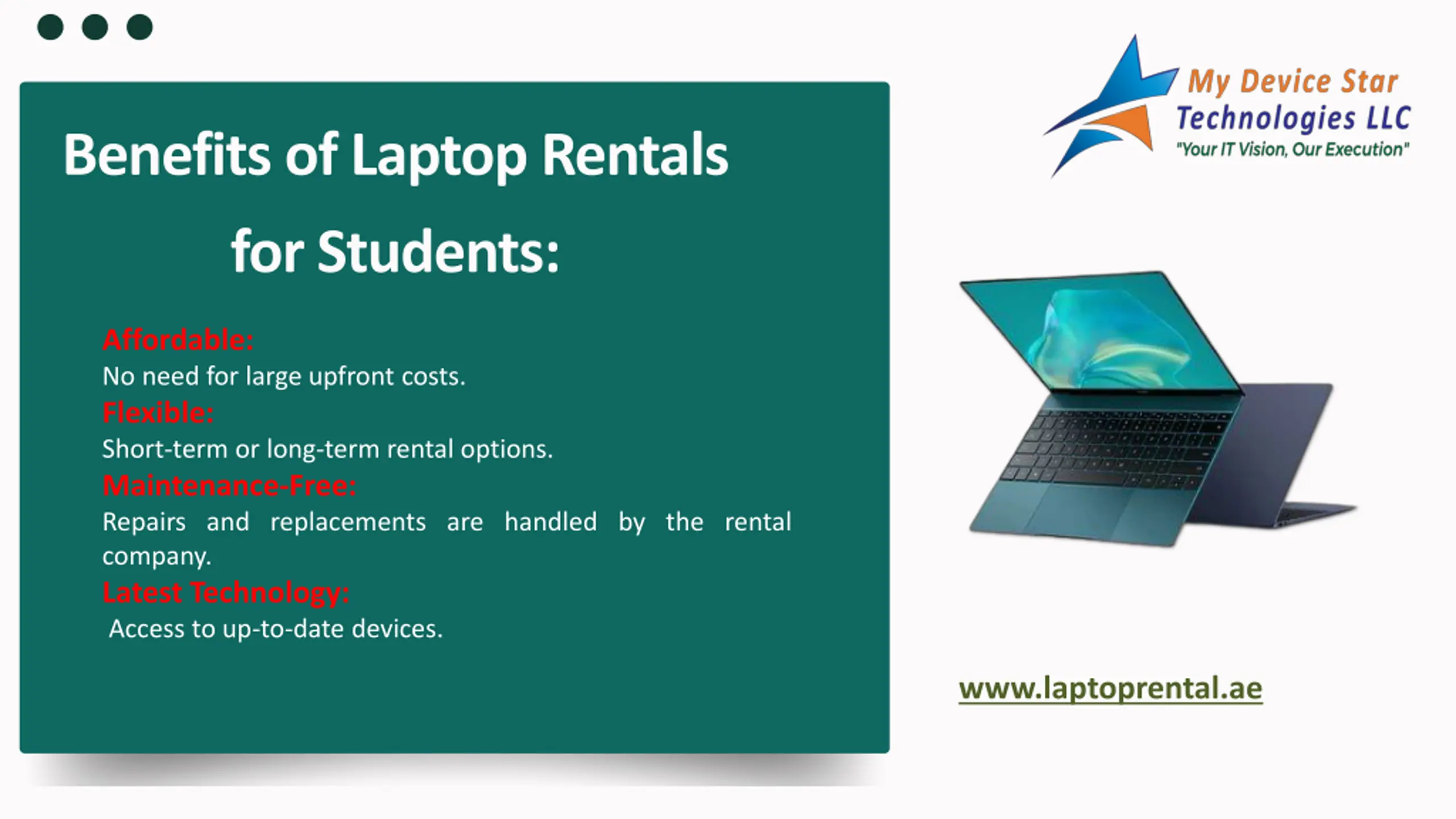 Contact Information Discover affordable Laptop Rentals for Students in Dubai, UAE with My Device Star Technologies LLC the perfect solution for your study needs Get more info Reach us at +971-55-1347228. Visit our website here www.laptoprental.ae.