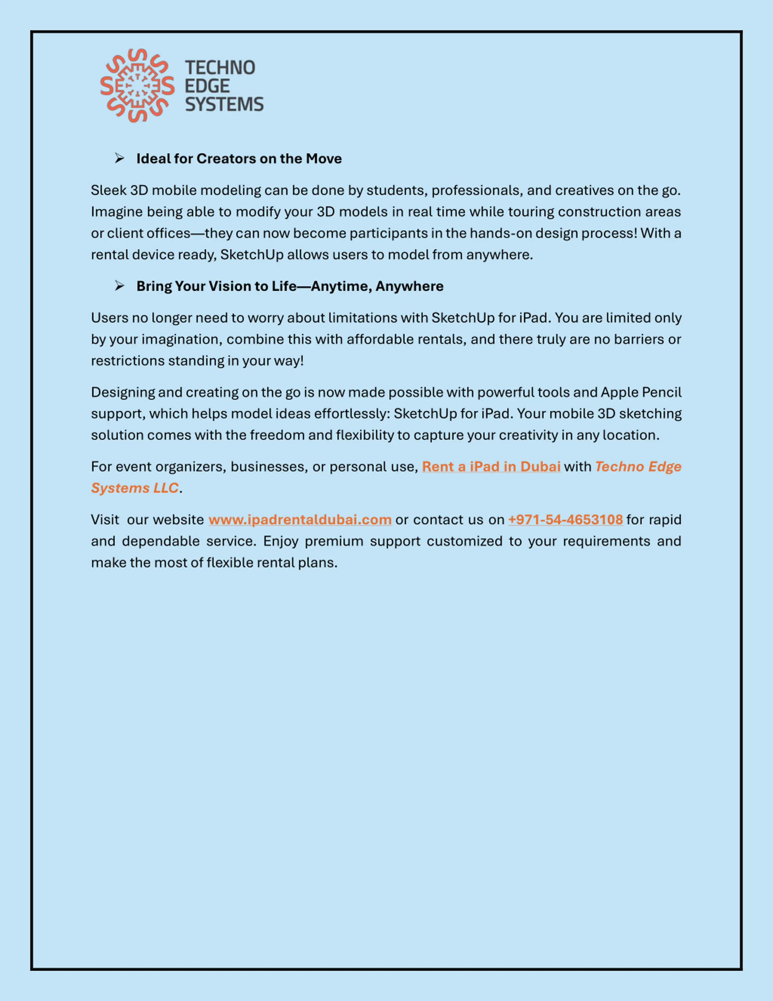 Ideal for Creators on the Move Sleek 3D mobile modeling can be done by students, professionals, and creatives on the go. Imagine being able to modify your 3D models in real time while touring construction areas or client offices they can now become participants in the hands-on design process! With a rental device ready, SketchUp allows users to model from anywhere. Bring Your Vision to Life Anytime, Anywhere Users no longer need to worry about limitations with SketchUp for iPad. You are limited only by your imagination, combine this with affordable rentals, and there truly are no barriers or restrictions standing in your way! Designing and creating on the go is now made possible with powerful tools and Apple Pencil support, which helps model ideas effortlessly: SketchUp for iPad. Your mobile 3D sketching solution comes with the freedom and flexibility to capture your creativity in any location. For event organizers, businesses, or personal use,Rent a iPad in DubaiwithTechno Edge Systems LLC. Visit our website www.ipadrentaldubai.comor contact us on+971-54-4653108for rapid and dependable service. Enjoy premium support customized to your requirements and make the most of flexible rental plans.