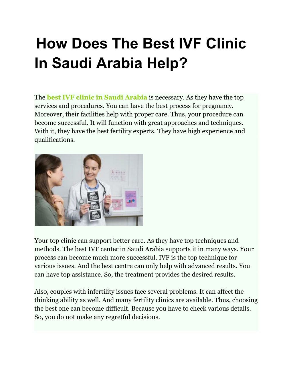 How Does The Best IVF Clinic In Saudi Arabia Help? Thebest IVF clinic in Saudi Arabia is necessary. As they have the top services and procedures. You can have the best process for pregnancy. Moreover, their facilities help with proper care. Thus, your procedure can become successful. It will function with great approaches and techniques. With it, they have the best fertility experts. They have high experience and qualifications. Your top clinic can support better care. As they have top techniques and methods. The best IVF center in Saudi Arabia supports it in many ways. Your process can become much more successful. IVF is the top technique for various issues. And the best centre can only help with advanced results. You can have top assistance. So, the treatment provides the desired results. Also, couples with infertility issues face several problems. It can affect the thinking ability as well. And many fertility clinics are available. Thus, choosing the best one can become difficult. Because you have to check various details. So, you do not make any regretful decisions.