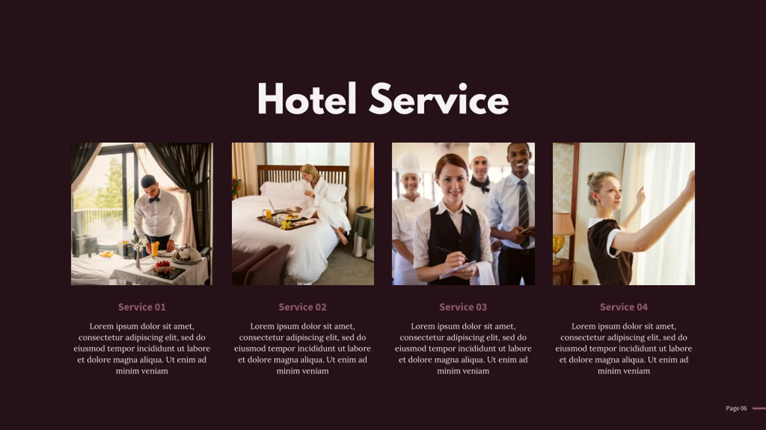 Hotel Service Service 01 Service 02 Service 03 Service 04 Lorem ipsum dolor sit amet, consectetur adipiscing elit, sed do eiusmod tempor incididunt ut labore et dolore magna aliqua. Ut enim ad minim veniam Lorem ipsum dolor sit amet, consectetur adipiscing elit, sed do eiusmod tempor incididunt ut labore et dolore magna aliqua. Ut enim ad minim veniam Lorem ipsum dolor sit amet, consectetur adipiscing elit, sed do eiusmod tempor incididunt ut labore et dolore magna aliqua. Ut enim ad minim veniam Lorem ipsum dolor sit amet, consectetur adipiscing elit, sed do eiusmod tempor incididunt ut labore et dolore magna aliqua. Ut enim ad minim veniam Page 06