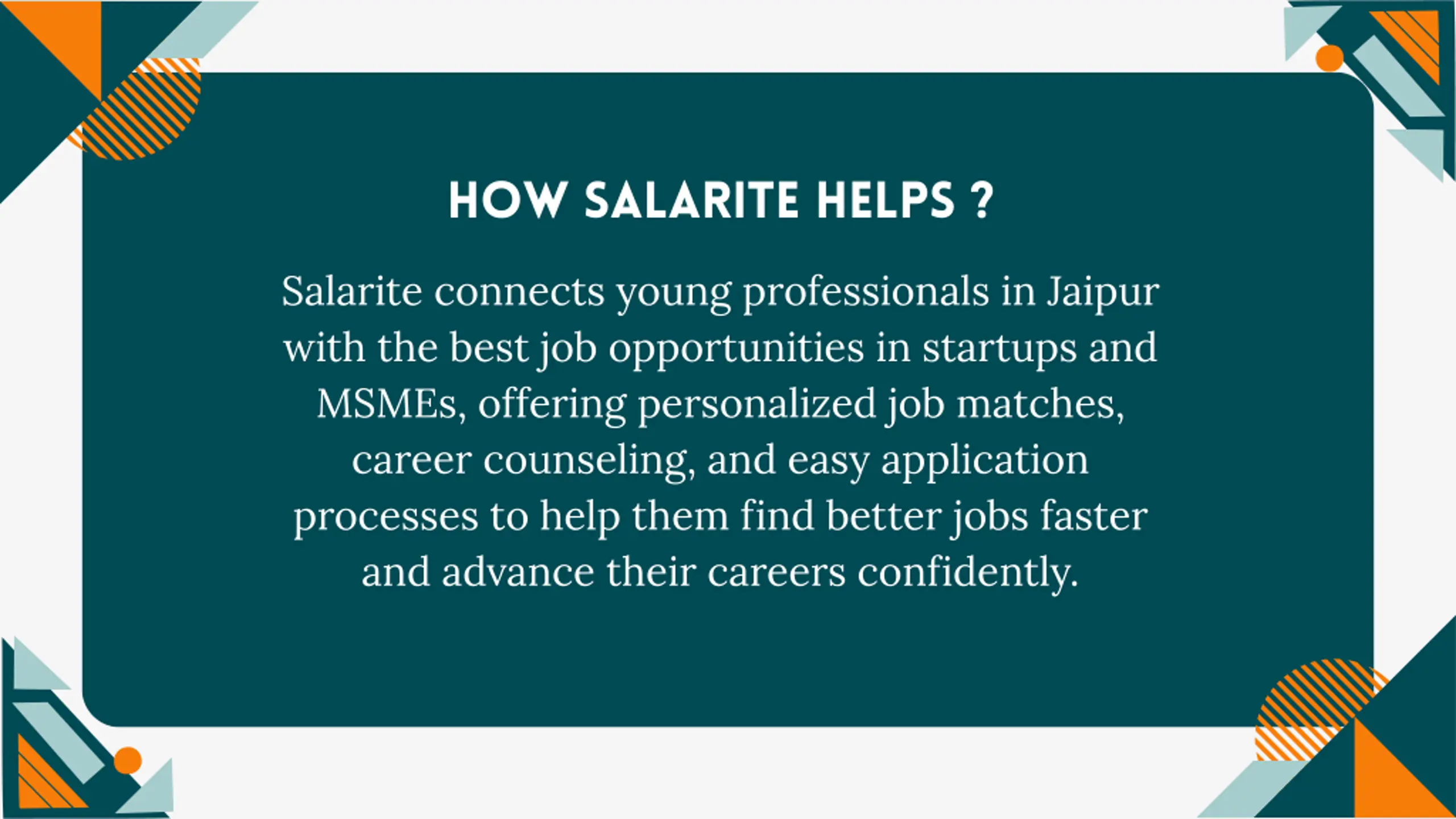 How Salarite Helps ? Salarite connects young professionals in Jaipur with the best job opportunities in startups and MSMEs, offering personalized job matches, career counseling, and easy application processes to help them find better jobs faster and advance their careers confidently.