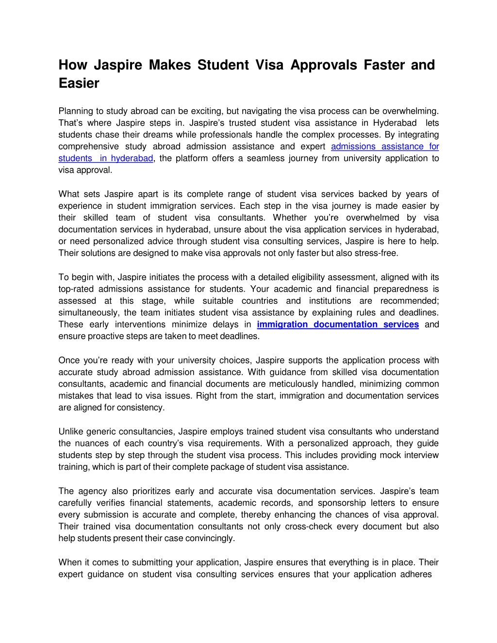 How Jaspire Makes Student Visa Approvals Faster and Easier Planning to study abroad can be exciting, but navigating the visa process can be overwhelming. That s where Jaspire steps in. Jaspire s trusted student visa assistance in Hyderabad lets students chase their dreams while professionals handle the complex processes. By integrating comprehensive study abroad admission assistance and expert admissions assistance for students in hyderabad, the platform offers a seamless journey from university application to visa approval. What sets Jaspire apart is its complete range of student visa services backed by years of experience in student immigration services. Each step in the visa journey is made easier by their skilled team of student visa consultants. Whether you re overwhelmed by visa documentation services in hyderabad, unsure about the visa application services in hyderabad, or need personalized advice through student visa consulting services, Jaspire is here to help. Their solutions are designed to make visa approvals not only faster but also stress-free. To begin with, Jaspire initiates the process with a detailed eligibility assessment, aligned with its top-rated admissions assistance for students. Your academic and financial preparedness is assessed at this stage, while suitable countries and institutions are recommended; simultaneously, the team initiates student visa assistance by explaining rules and deadlines. These early interventions minimize delays in immigration documentation services and ensure proactive steps are taken to meet deadlines. Once you re ready with your university choices, Jaspire supports the application process with accurate study abroad admission assistance. With guidance from skilled visa documentation consultants, academic and financial documents are meticulously handled, minimizing common mistakes that lead to visa issues. Right from the start, immigration and documentation services are aligned for consistency. Unlike generic consultancies, Jaspire employs trained student visa consultants who understand the nuances of each country s visa requirements. With a personalized approach, they guide students step by step through the student visa process. This includes providing mock interview training, which is part of their complete package of student visa assistance. The agency also prioritizes early and accurate visa documentation services. Jaspire s team carefully verifies financial statements, academic records, and sponsorship letters to ensure every submission is accurate and complete, thereby enhancing the chances of visa approval. Their trained visa documentation consultants not only cross-check every document but also help students present their case convincingly. When it comes to submitting your application, Jaspire ensures that everything is in place. Their expert guidance on student visa consulting services ensures that your application adheres