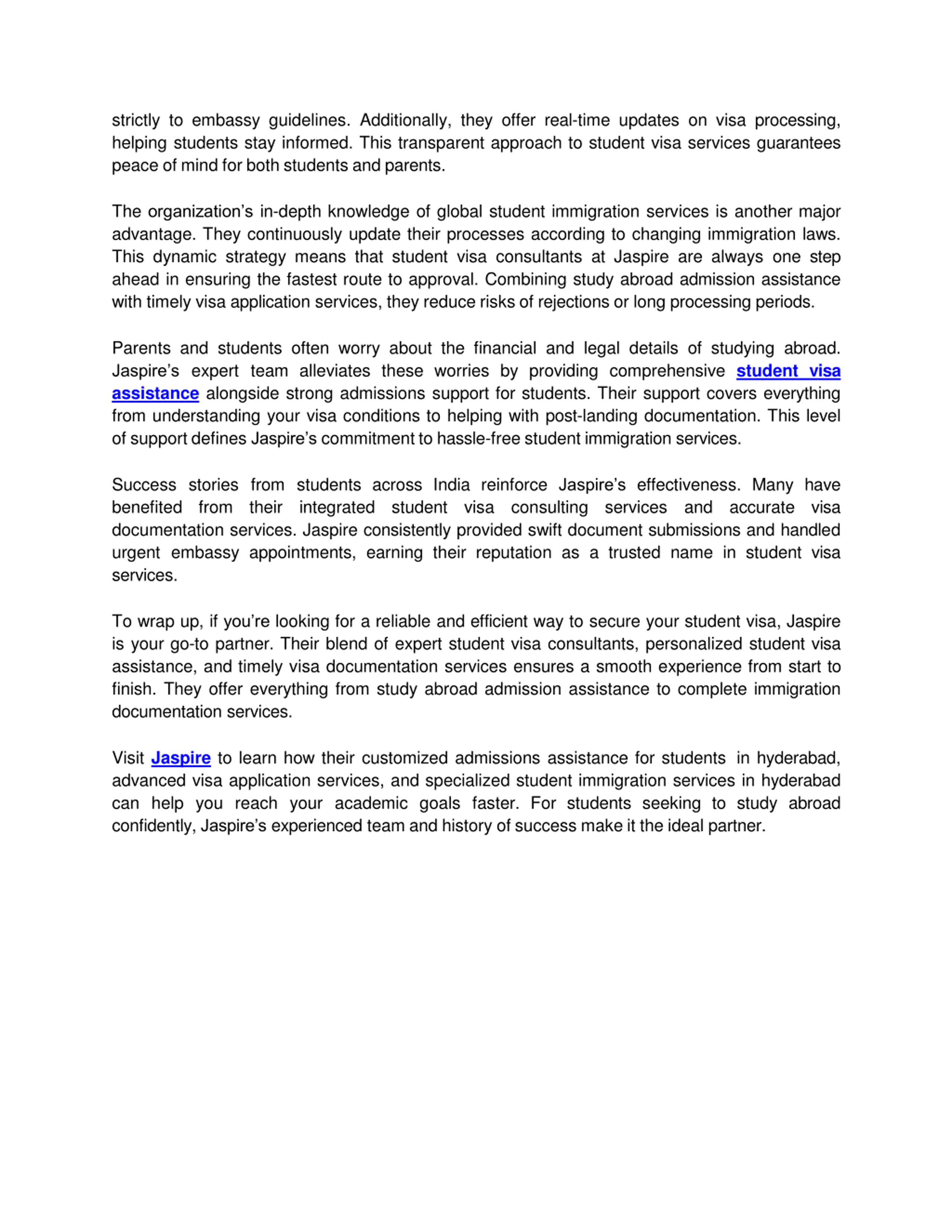 strictly to embassy guidelines. Additionally, they offer real-time updates on visa processing, helping students stay informed. This transparent approach to student visa services guarantees peace of mind for both students and parents. The organization s in-depth knowledge of global student immigration services is another major advantage. They continuously update their processes according to changing immigration laws. This dynamic strategy means that student visa consultants at Jaspire are always one step ahead in ensuring the fastest route to approval. Combining study abroad admission assistance with timely visa application services, they reduce risks of rejections or long processing periods. Parents and students often worry about the financial and legal details of studying abroad. Jaspire s expert team alleviates these worries by providing comprehensive student visa assistance alongside strong admissions support for students. Their support covers everything from understanding your visa conditions to helping with post-landing documentation. This level of support defines Jaspire s commitment to hassle-free student immigration services. Success stories from students across India reinforce Jaspire s effectiveness. Many have benefited from their integrated student visa consulting services and accurate visa documentation services. Jaspire consistently provided swift document submissions and handled urgent embassy appointments, earning their reputation as a trusted name in student visa services. To wrap up, if you re looking for a reliable and efficient way to secure your student visa, Jaspire is your go-to partner. Their blend of expert student visa consultants, personalized student visa assistance, and timely visa documentation services ensures a smooth experience from start to finish. They offer everything from study abroad admission assistance to complete immigration documentation services. Visit Jaspire to learn how their customized admissions assistance for students in hyderabad, advanced visa application services, and specialized student immigration services in hyderabad can help you reach your academic goals faster. For students seeking to study abroad confidently, Jaspire s experienced team and history of success make it the ideal partner.