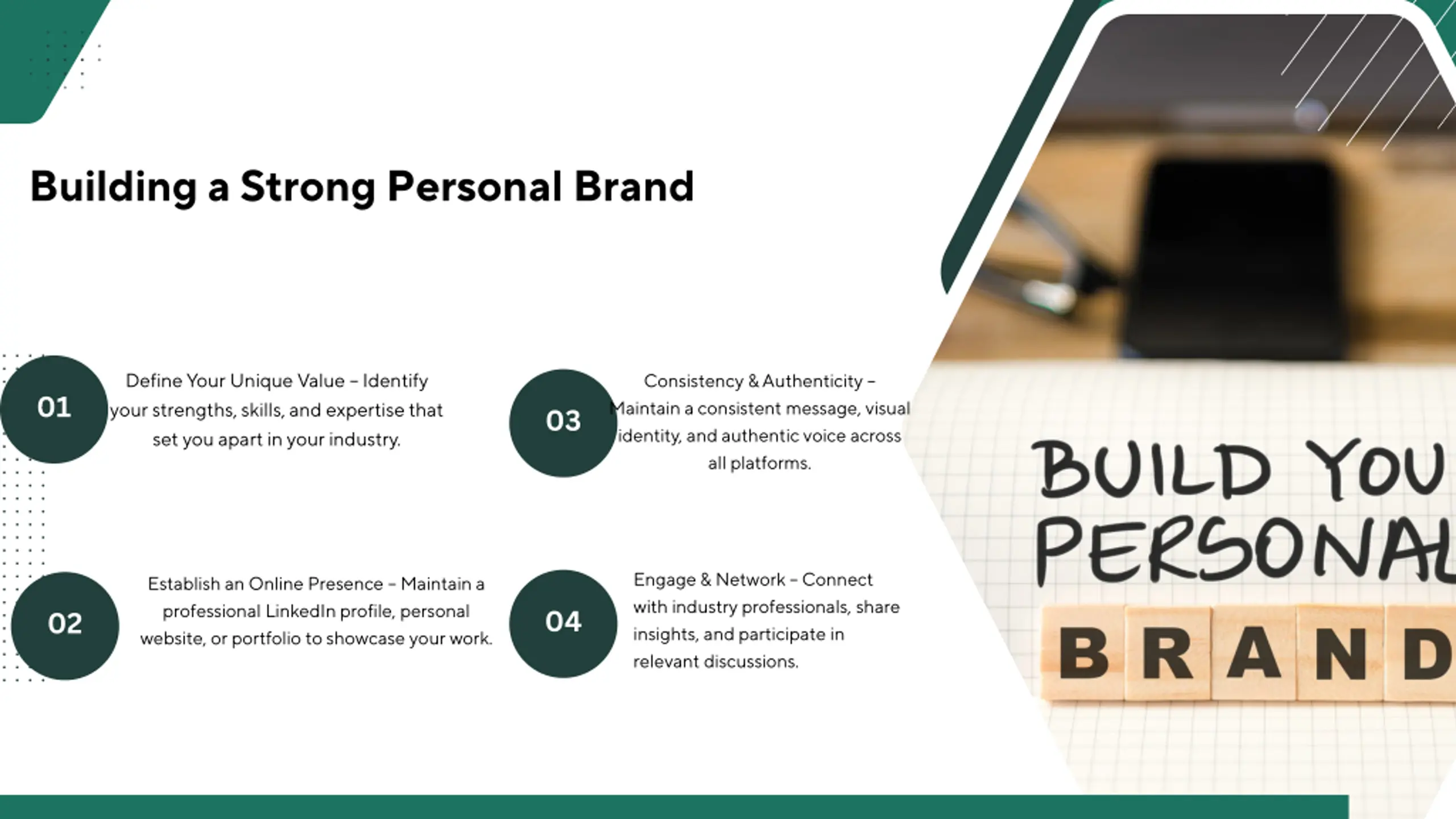 Building a Strong Personal Brand Define Your Unique Value Identify your strengths, skills, and expertise that set you apart in your industry. Consistency & Authenticity Maintain a consistent message, visual identity, and authentic voice across all platforms. 01 03 Engage & Network Connect with industry professionals, share insights, and participate in relevant discussions. Establish an Online Presence Maintain a professional LinkedIn profile, personal website, or portfolio to showcase your work. 04 02