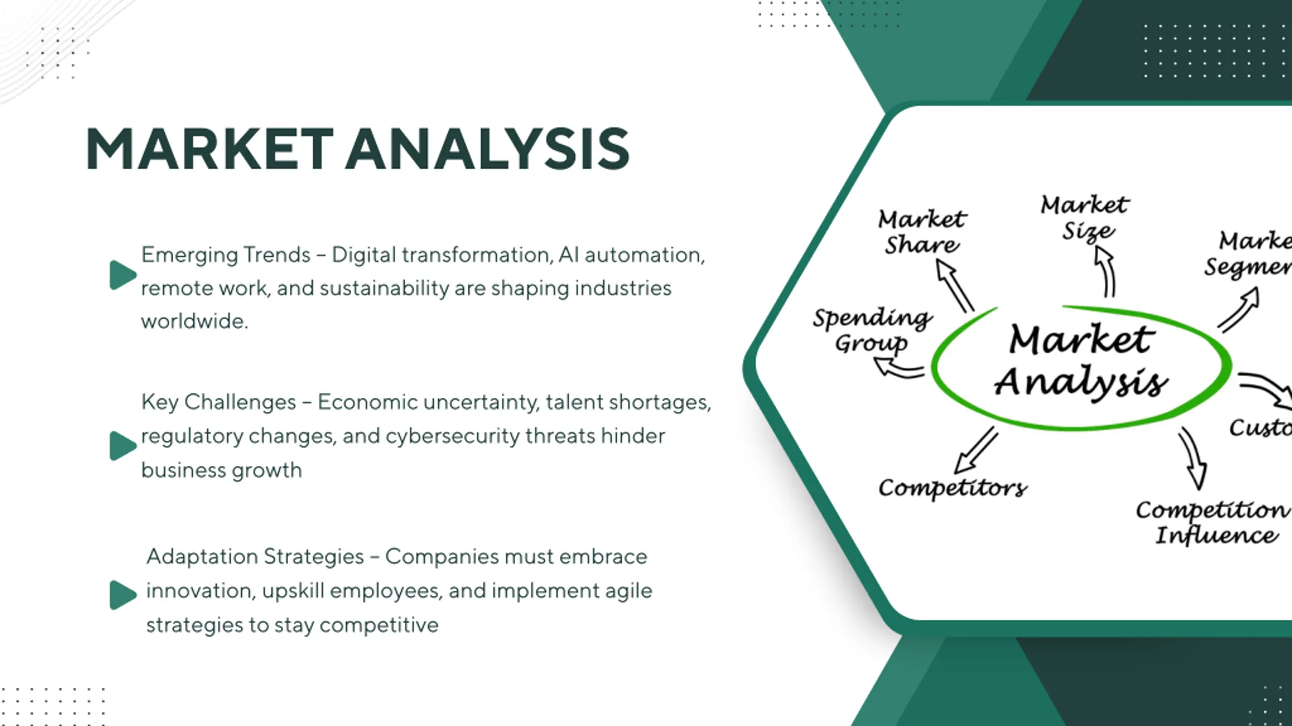 MARKET ANALYSIS Emerging Trends Digital transformation, AI automation, remote work, and sustainability are shaping industries worldwide. Key Challenges Economic uncertainty, talent shortages, regulatory changes, and cybersecurity threats hinder business growth Adaptation Strategies Companies must embrace innovation, upskill employees, and implement agile strategies to stay competitive