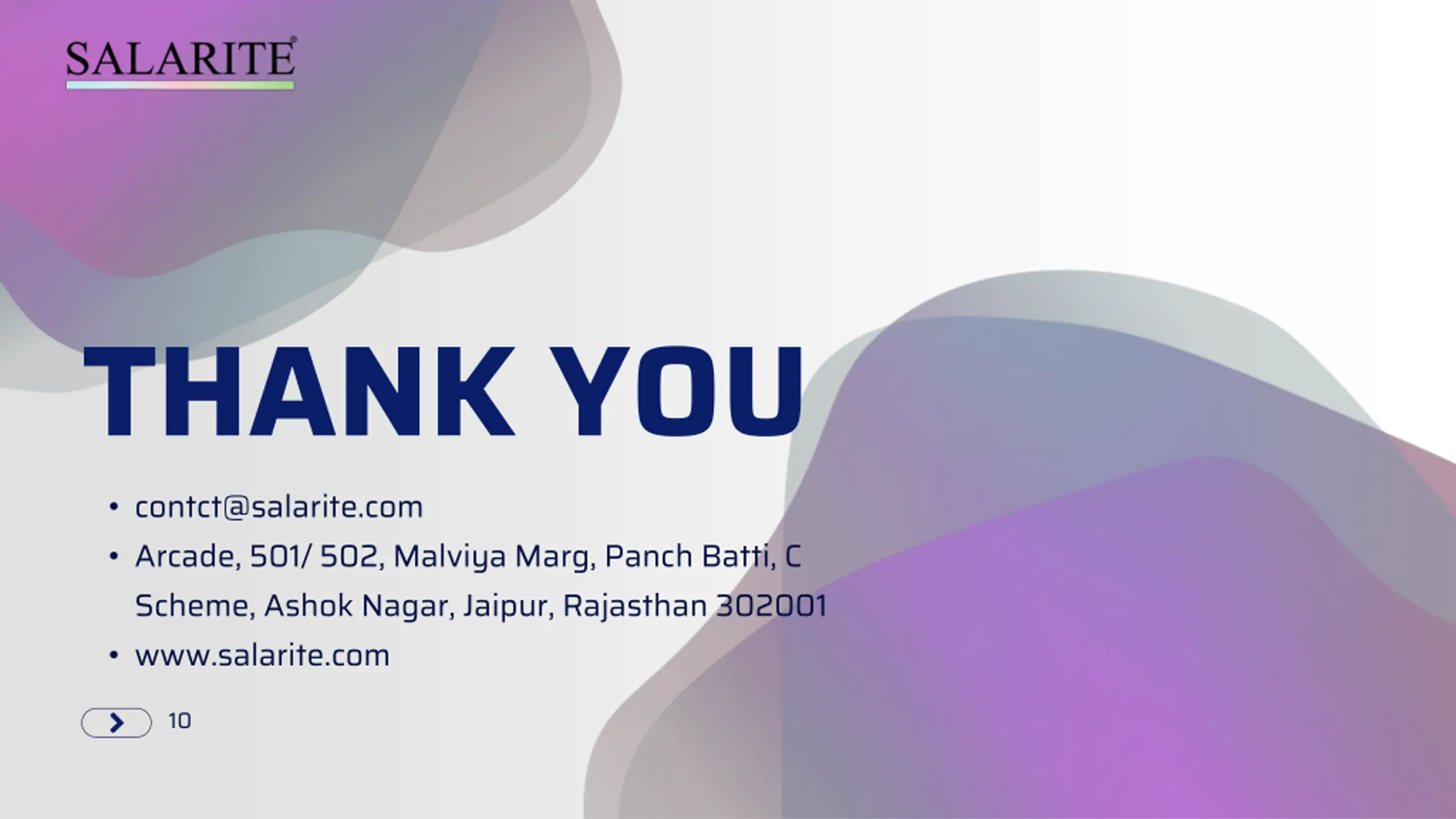 THANK YOU contct@salarite.com Arcade, 501/ 502, Malviya Marg, Panch Batti, C Scheme, Ashok Nagar, Jaipur, Rajasthan 302001 www.salarite.com 10
