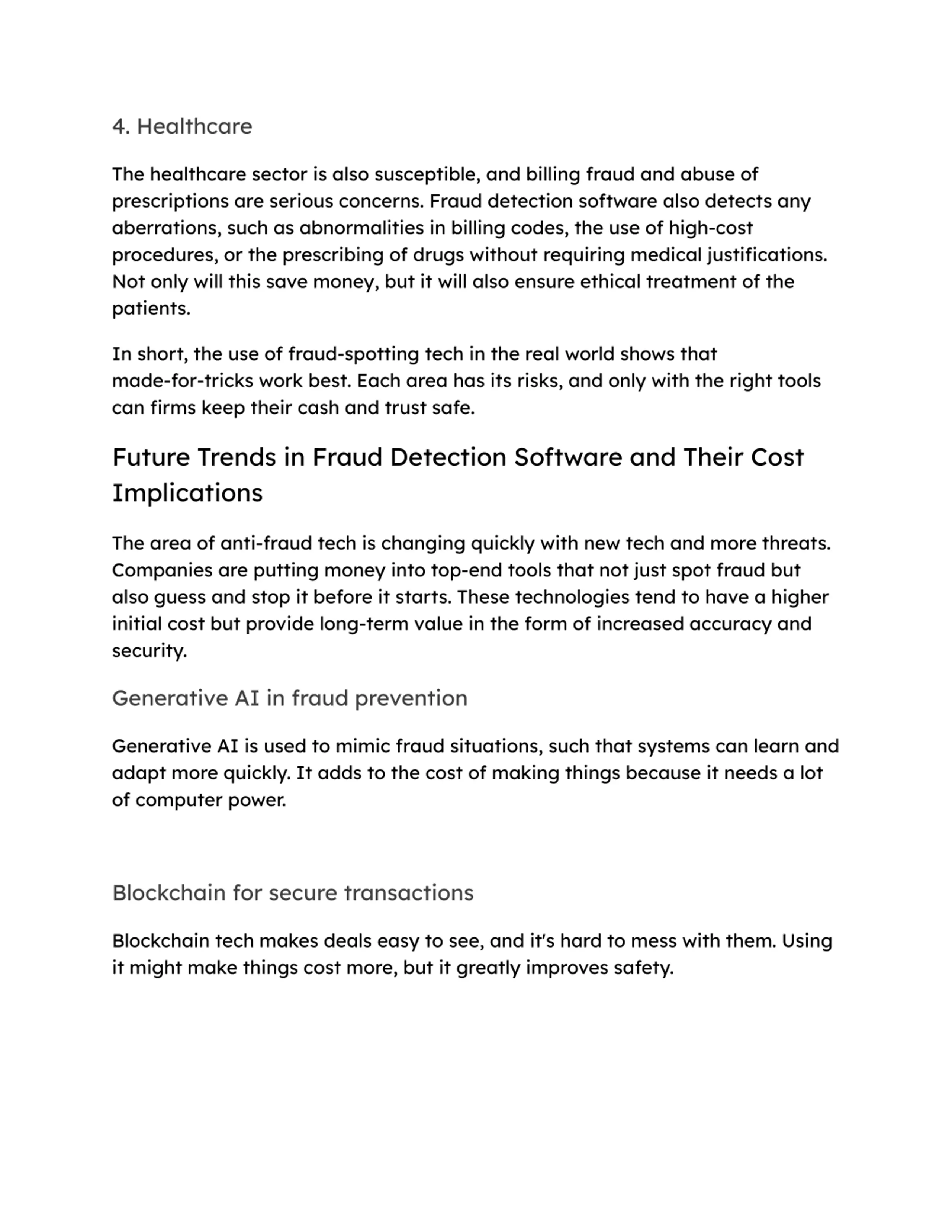 4. Healthcare The healthcare sector is also susceptible, and billing fraud and abuse of prescriptions are serious concerns. Fraud detection software also detects any aberrations, such as abnormalities in billing codes, the use of high-cost procedures, or the prescribing of drugs without requiring medical justifications. Not only will this save money, but it will also ensure ethical treatment of the patients. In short, the use of fraud-spotting tech in the real world shows that made-for-tricks work best. Each area has its risks, and only with the right tools can firms keep their cash and trust safe. Future Trends in Fraud Detection Software and Their Cost Implications The area of anti-fraud tech is changing quickly with new tech and more threats. Companies are putting money into top-end tools that not just spot fraud but also guess and stop it before it starts. These technologies tend to have a higher initial cost but provide long-term value in the form of increased accuracy and security. Generative AI in fraud prevention Generative AI is used to mimic fraud situations, such that systems can learn and adapt more quickly. It adds to the cost of making things because it needs a lot of computer power. Blockchain for secure transactions Blockchain tech makes deals easy to see, and it's hard to mess with them. Using it might make things cost more, but it greatly improves safety.