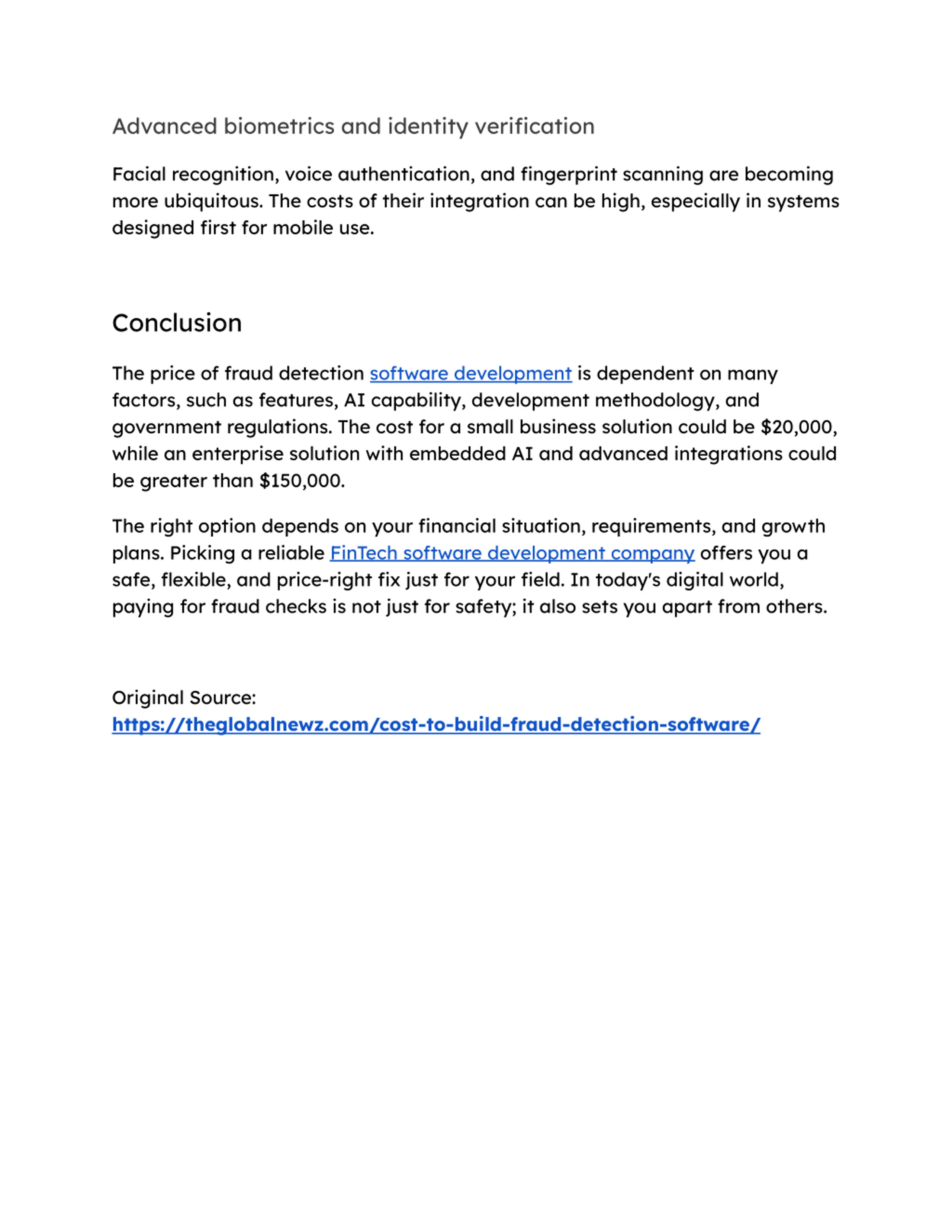 Advanced biometrics and identity verification Facial recognition, voice authentication, and fingerprint scanning are becoming more ubiquitous. The costs of their integration can be high, especially in systems designed first for mobile use. Conclusion The price of fraud detection software development is dependent on many factors, such as features, AI capability, development methodology, and government regulations. The cost for a small business solution could be $20,000, while an enterprise solution with embedded AI and advanced integrations could be greater than $150,000. The right option depends on your financial situation, requirements, and growth plans. Picking a reliable FinTech software development company offers you a safe, flexible, and price-right fix just for your field. In today's digital world, paying for fraud checks is not just for safety; it also sets you apart from others. Original Source: https://theglobalnewz.com/cost-to-build-fraud-detection-software/